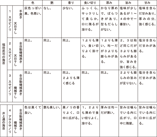 行徳漁協の福田武司の3種類のスサビ海苔と、現在、僕が使用している木更津漁協の井上通のアサクサ海苔との比較を以下の表にまとめた。