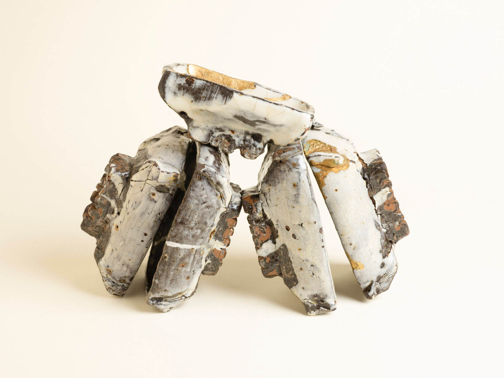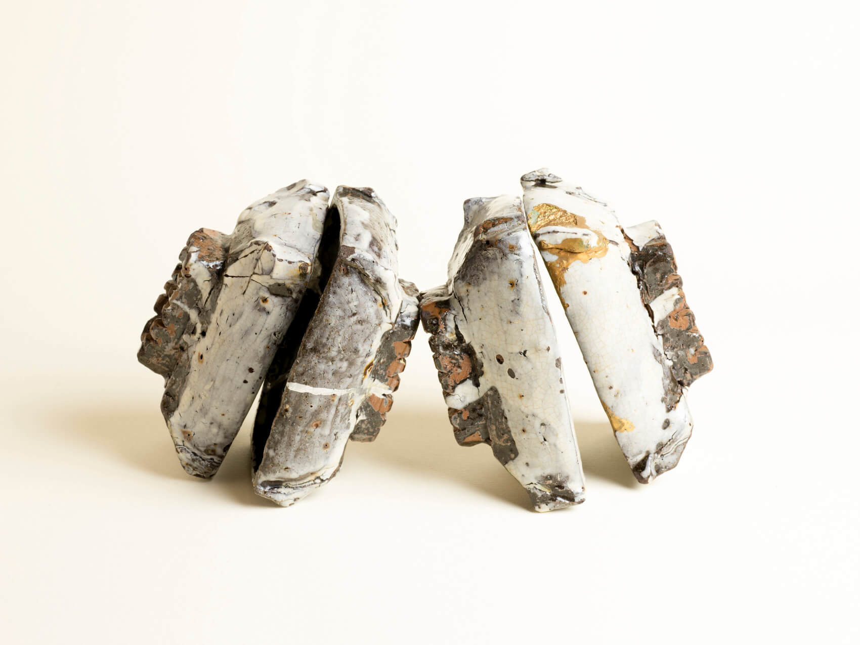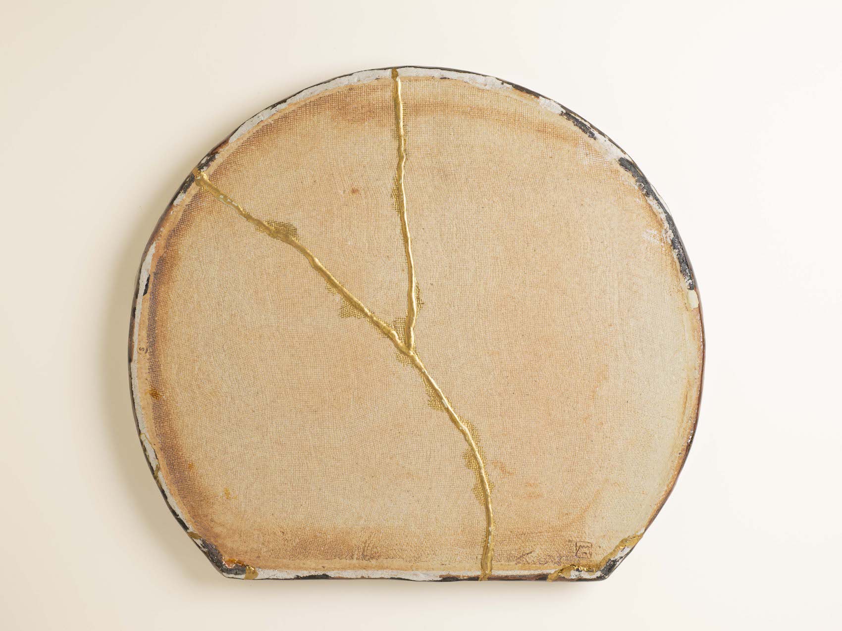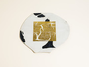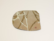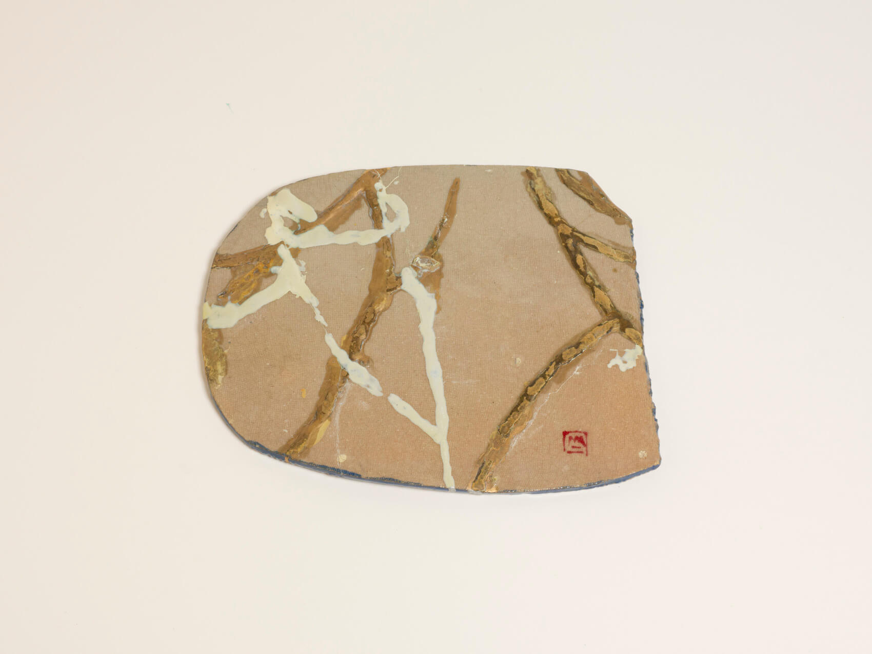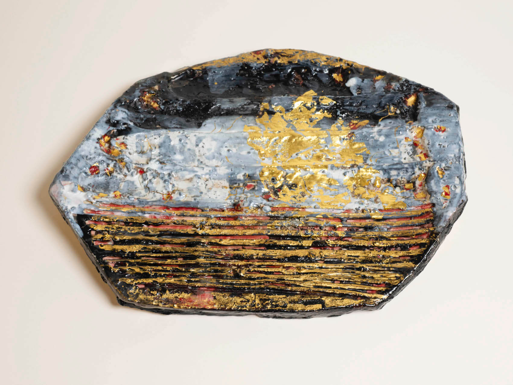 李朝白磁壺写し金箔載せ握り皿 22×18×0.3 写真の天地が逆さまになつている。 韓国李朝の白磁、粉引きの器は、僕にとっては深く深く心惹かれるものがある。 大阪の東洋陶磁美術館は、その最大のコレクションを誇り、年2回10年にわたって鑑賞に出かけた。 素朴ながら静しつな佇まいの白磁壺に金箔のベタ貼りとは、意外な組み合わせの思いつきであつたが、金箔が抵抗してか地割れを起こし、面白い風情となった。好きで多用!