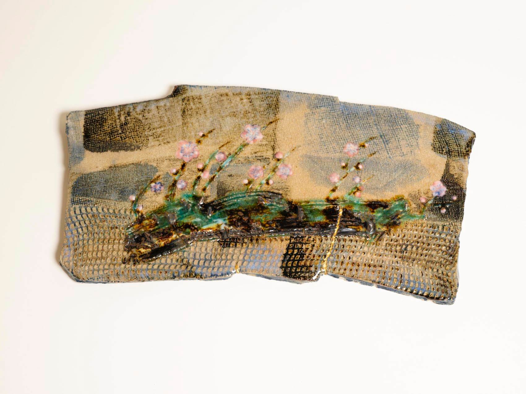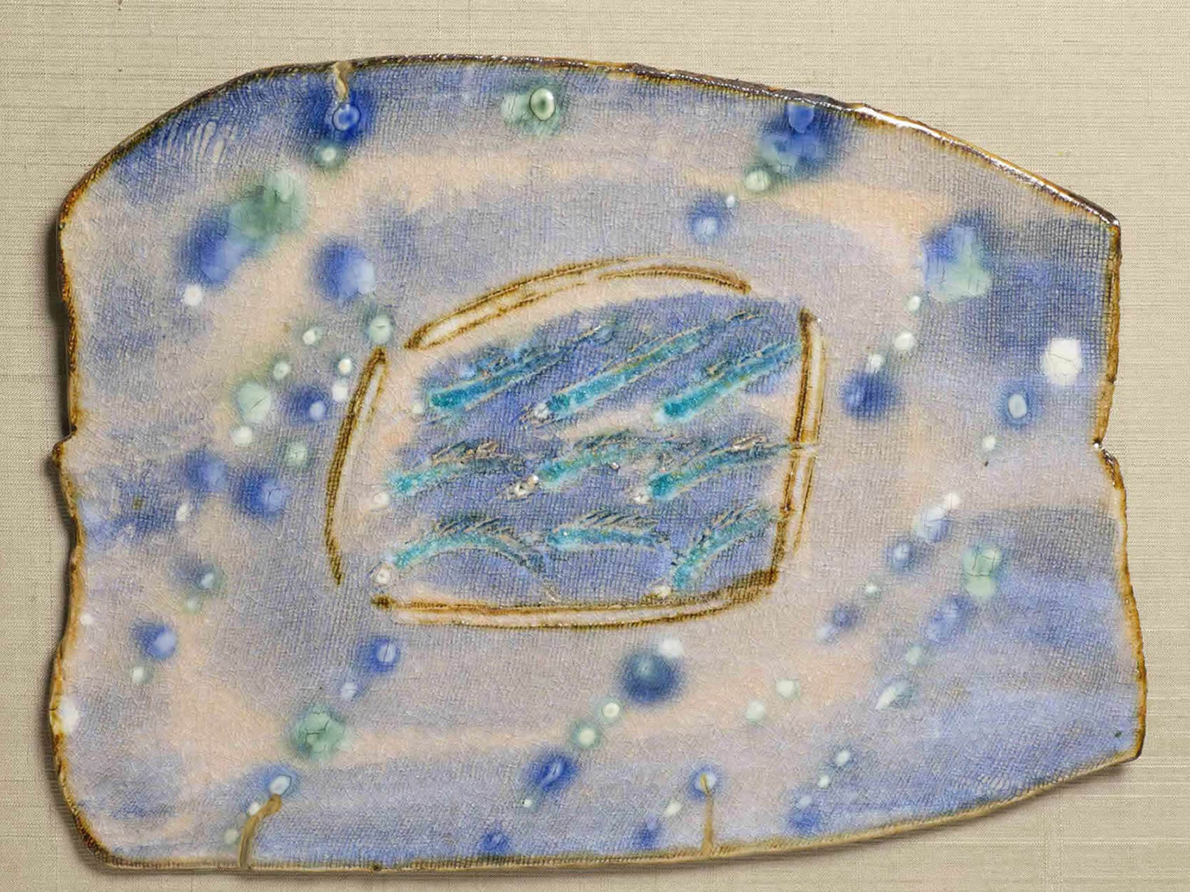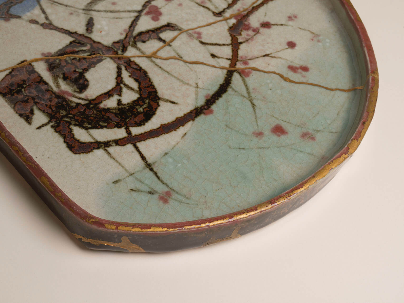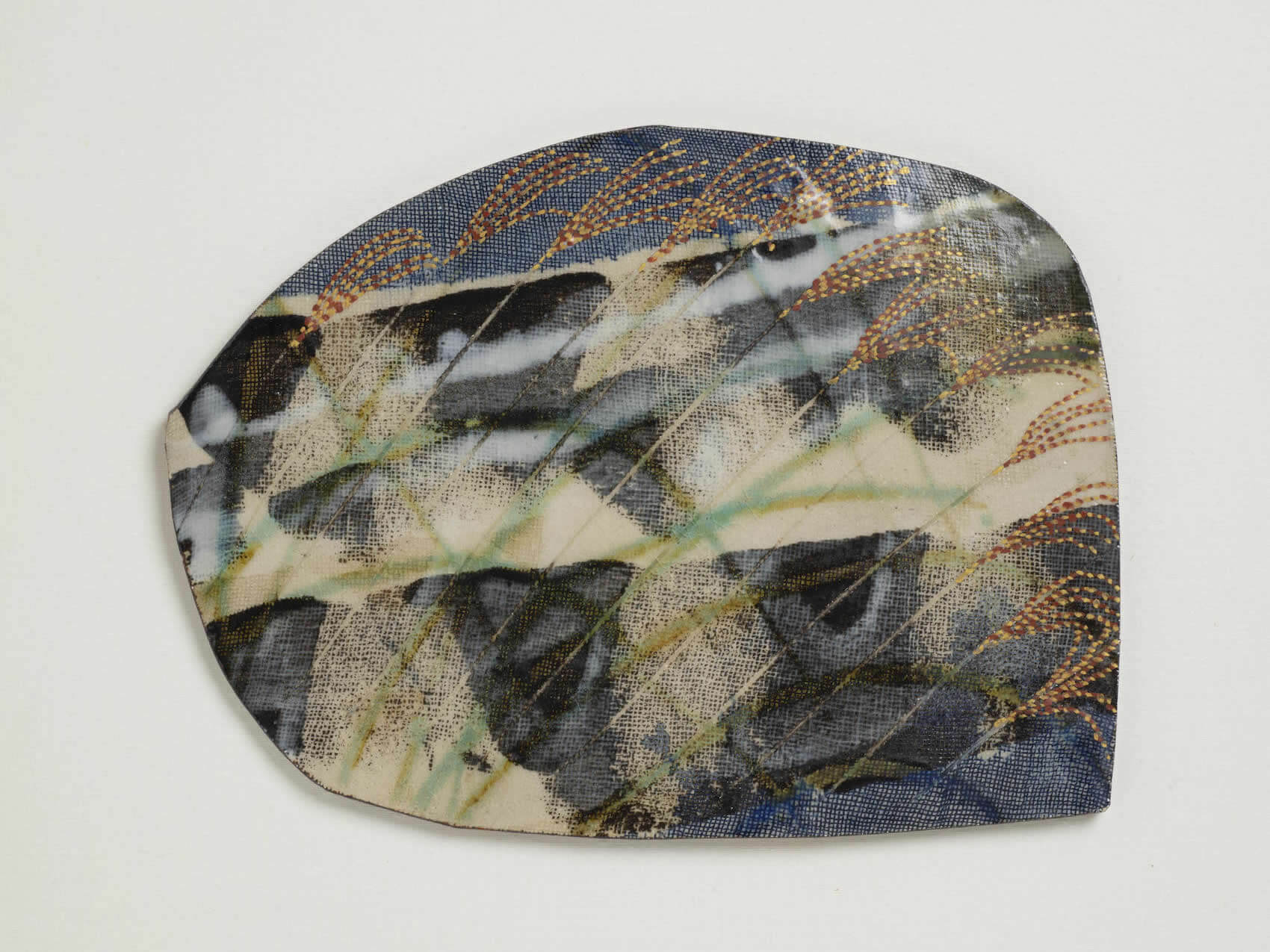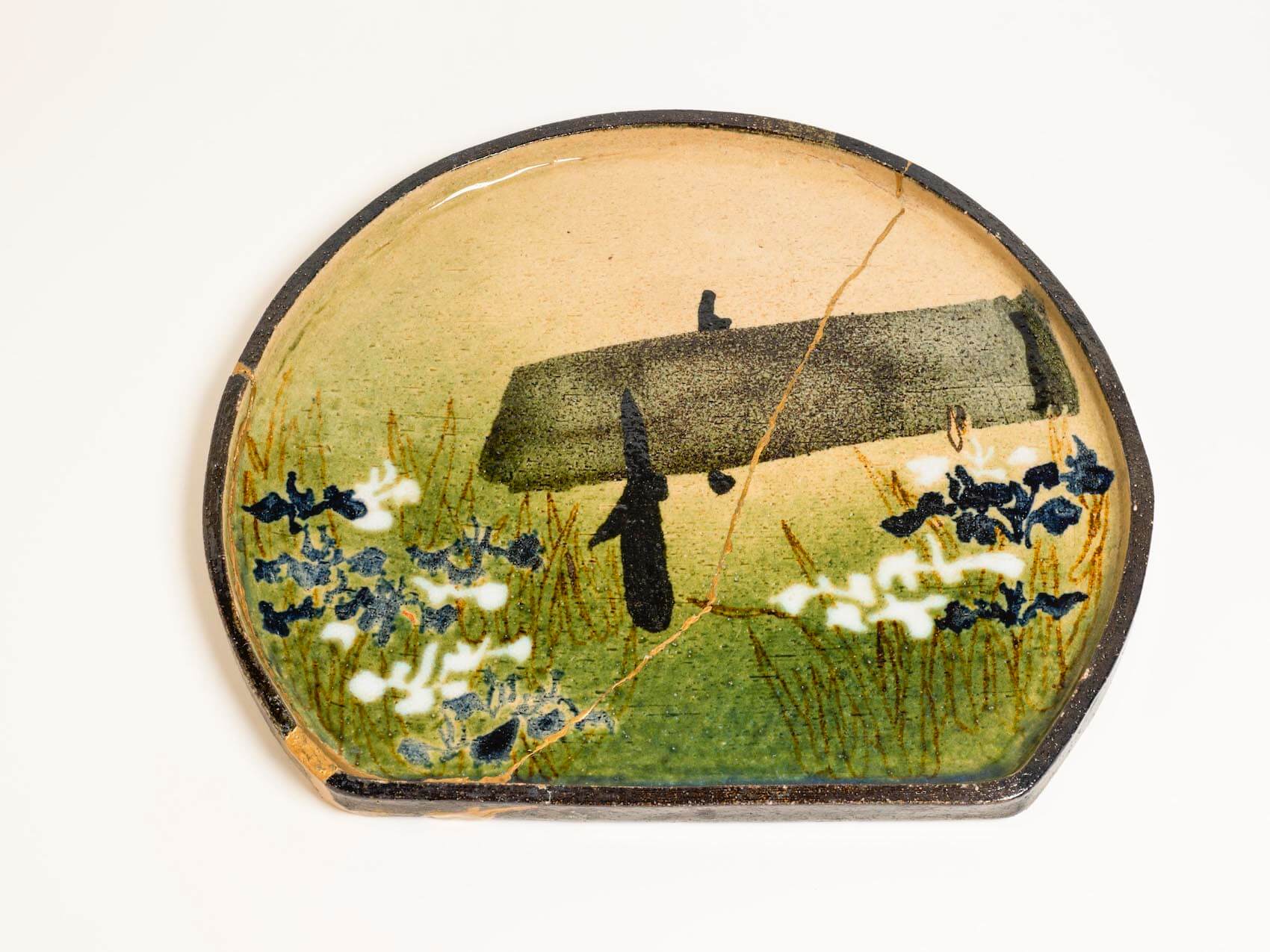 本阿弥光悦、八つ橋図写し扇面飾り皿 36.5×32.5×2 40年前、前田青邨の紅白梅図を扇面皿に写し、見事に大成功。 喜びの中で味をひめ、その後すぐに本阿弥光悦の八つ橋を写すこととなった。 主役の八つ橋を朱墨で描き、その周りをラテックスで伏せる。 その後朱墨をなぞりながら、橋を一気に描く。 ラテックスを剥がし、橋の周りに杜若(かきつばた)の葉を線描してゆく。 呉須と白化粧で花を咲かせる。 葉の周りに織部釉を吹きつけ、透明釉を掛ける。 随分と手の込んだことをやったものだと感心。 春の訪れに紅白梅図、初夏の始まりには八つ橋図と、長い年月楽しませてくれてきたのだつた。 斜めに見事に金継ぎが入る。