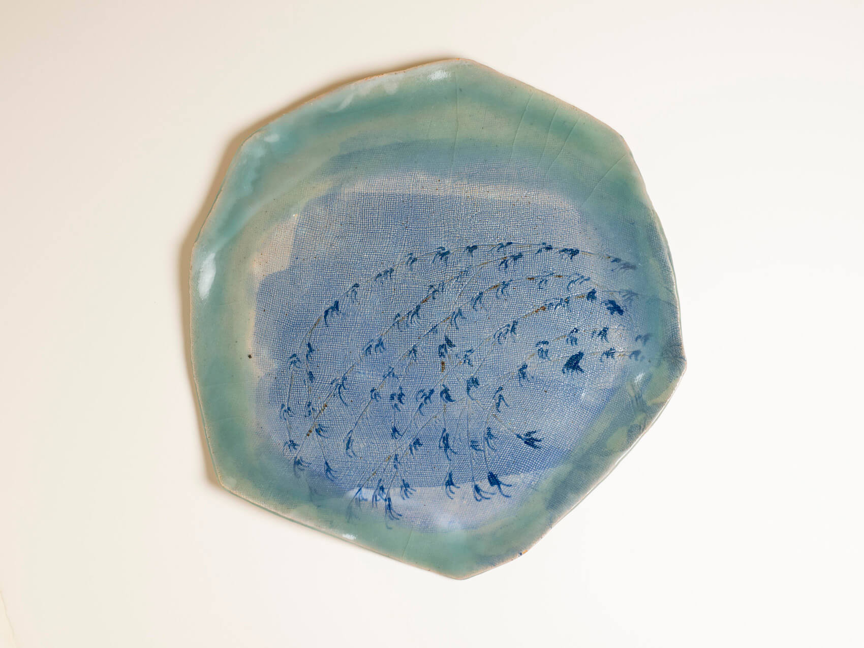 変形五角握り皿 27×26.5×3 青磁釉を平面の真ん中に、厚く盛り上げるように定着させるには、どうしたらいいのか? 挑戦だ! タタラの素焼きに布目を付け、白化粧をローラーで転がしながら部分的に塗る。 素焼き。 中央に余白を任意に残す。 その周りに染め付けを塗り、鉄を引き、そこに透明釉を掛ける。 さらそにその部分を水蝋で伏せ、余白の部位に、たっぷりと青磁釉を流し込む。 本焼き! 青磁釉の定着が成功! ウッヒッヒだった! 日本陶芸倶楽部品評会、最優秀賞受賞! やった!