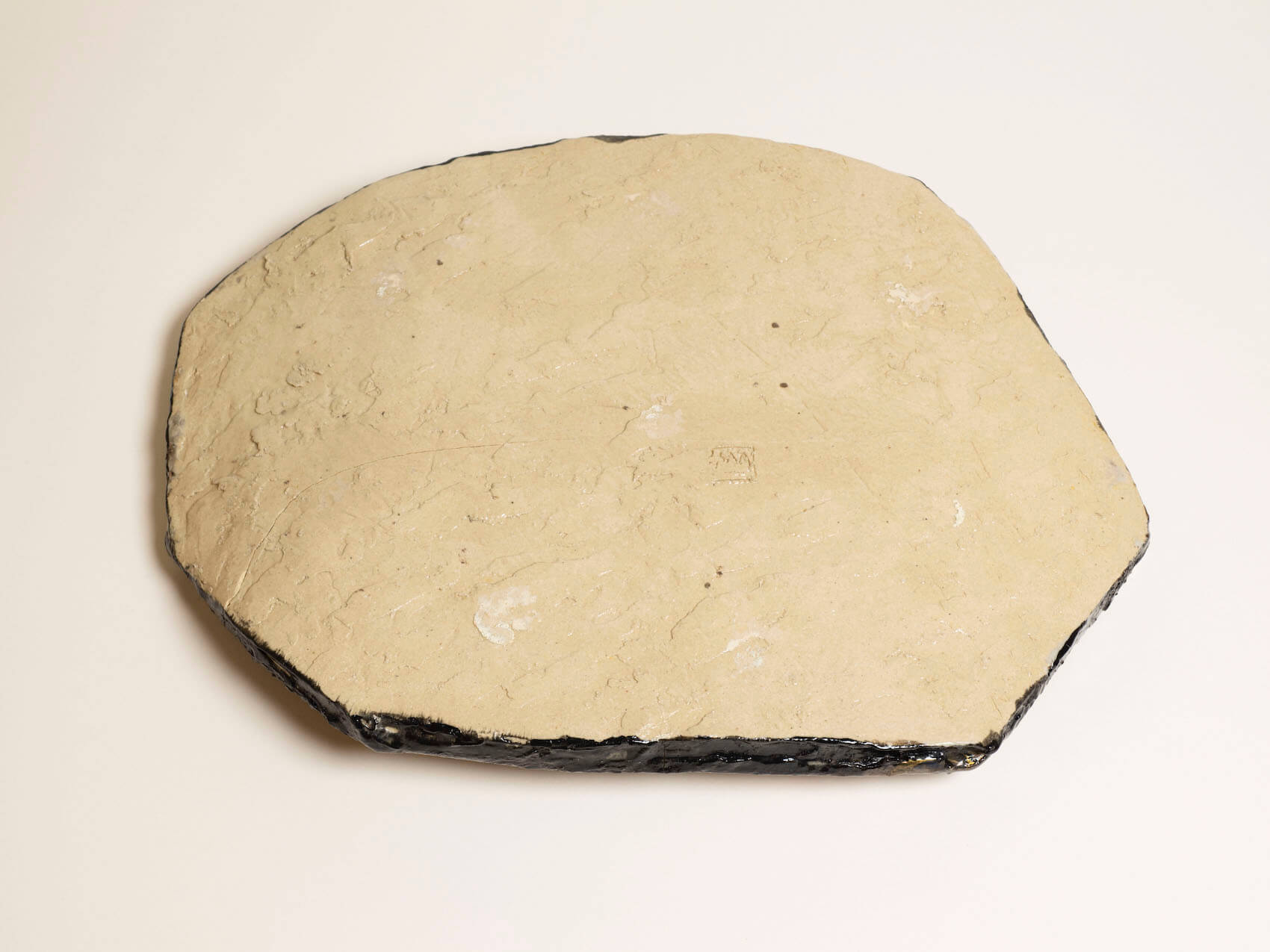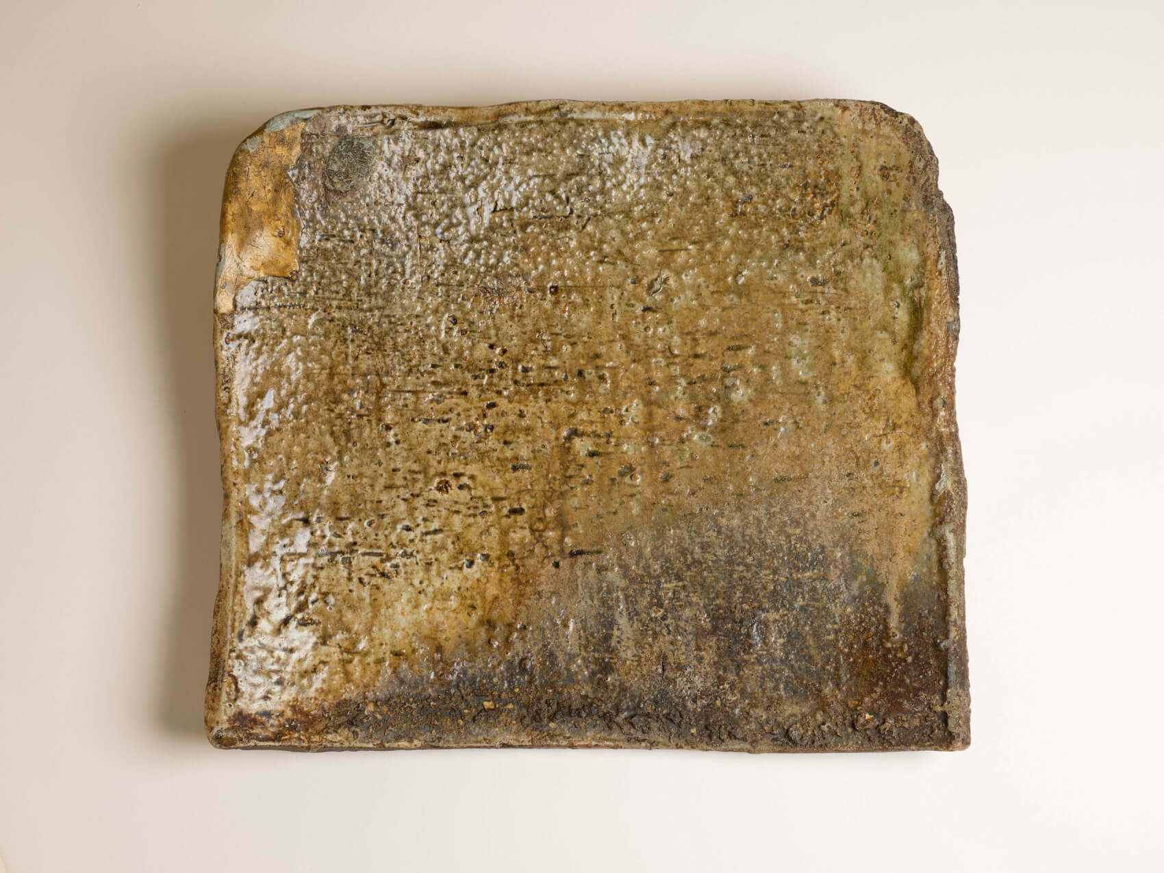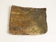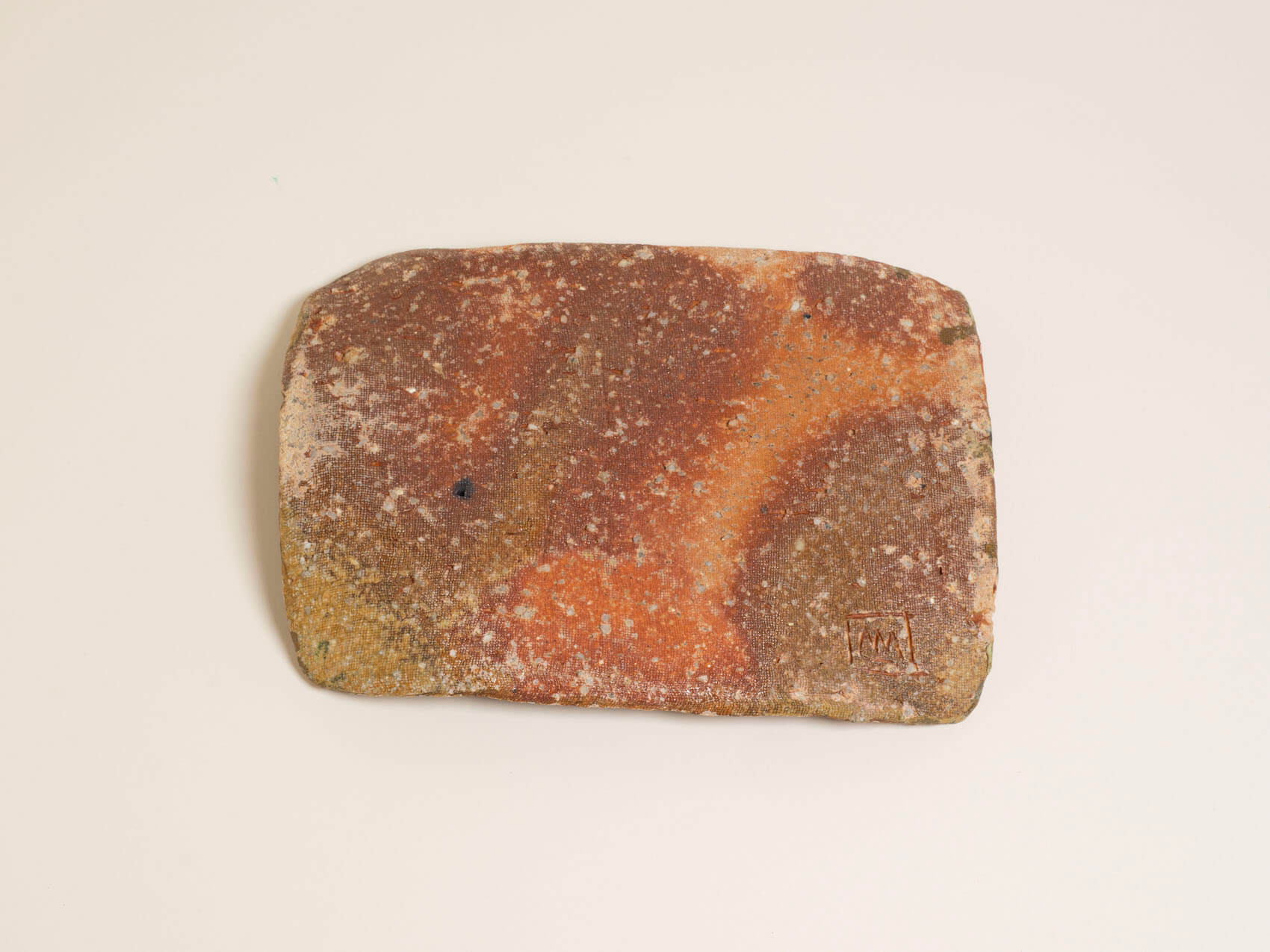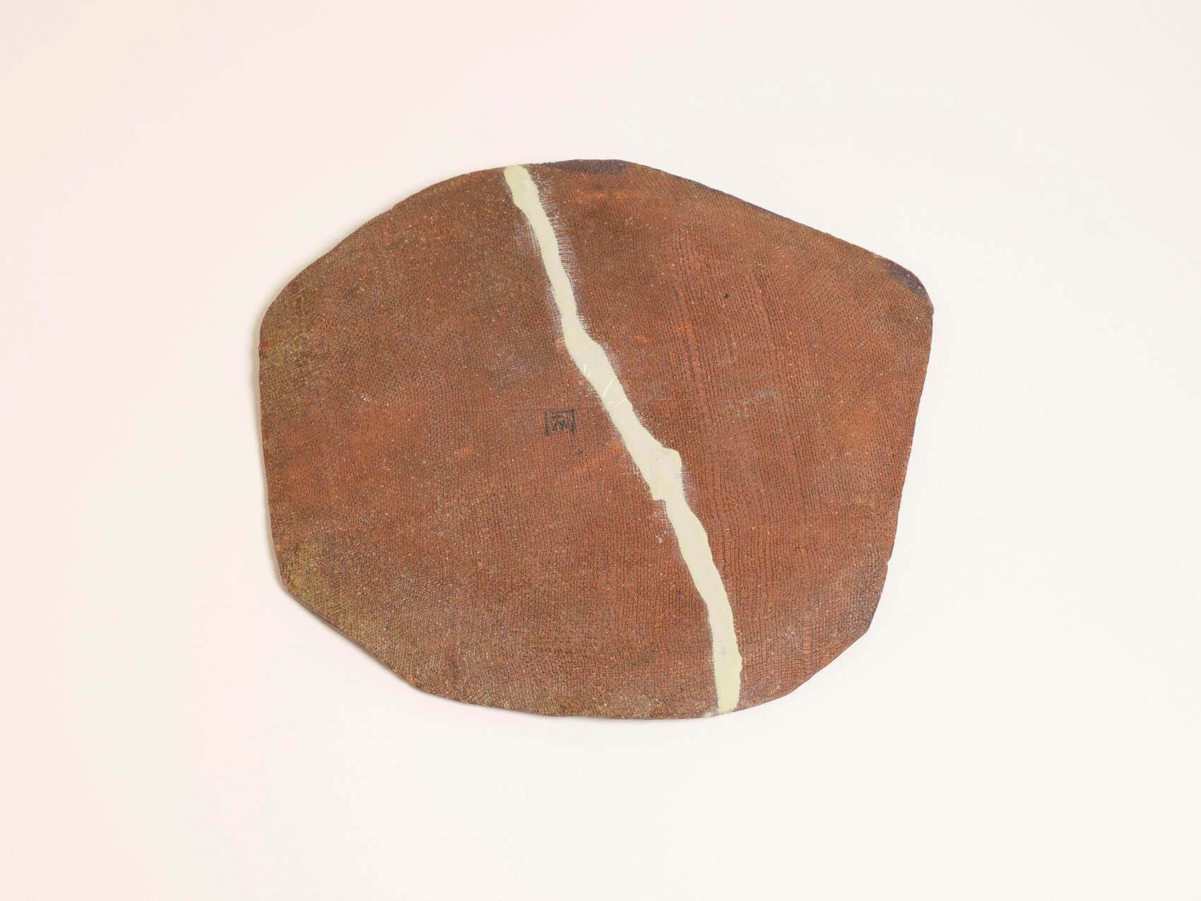 信楽焼大皿 35×32×4 信楽焼は信楽の土で、大量の赤松で、信楽独自の焼き方で焼くことによって焼き上がる。 しかし、さらに最も重要なことは、どれだけ素晴らしい独自の土を持っているか、そしてその作品を窯の何処へ入れるかが、全てとなる。この大皿は、この2倍の大皿として作ったのだが、乾燥の際、再三ど真ん中にひびが入り、遂に真っ二つに切っての焼成だつた。 この天然の釉薬となつた灰の被り方は尋常ではない素晴らしいものであつた。 この土は、信楽最高の作家であった故古谷道生さん独自の土である。 素晴らしい!僕の焼き物の誇りとなつた。