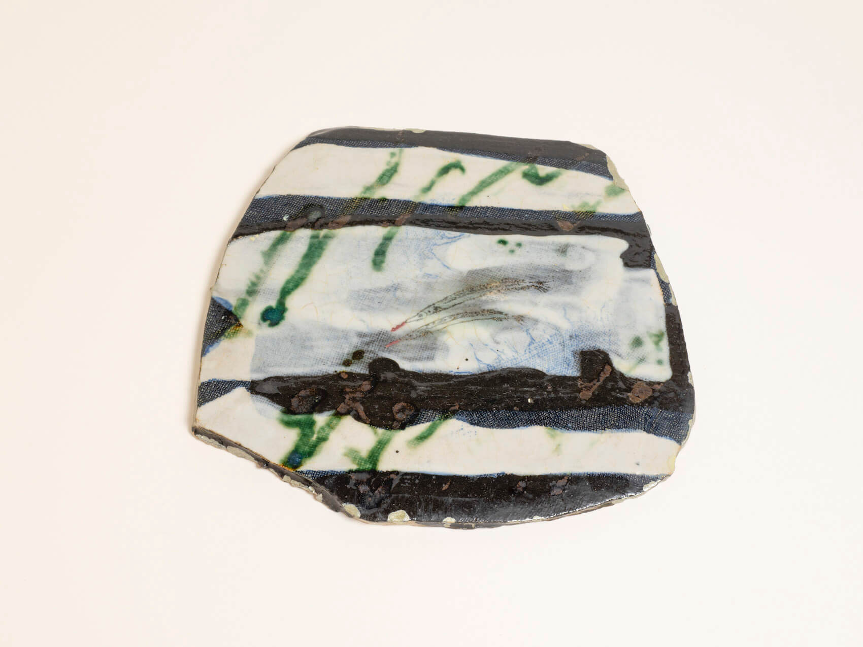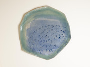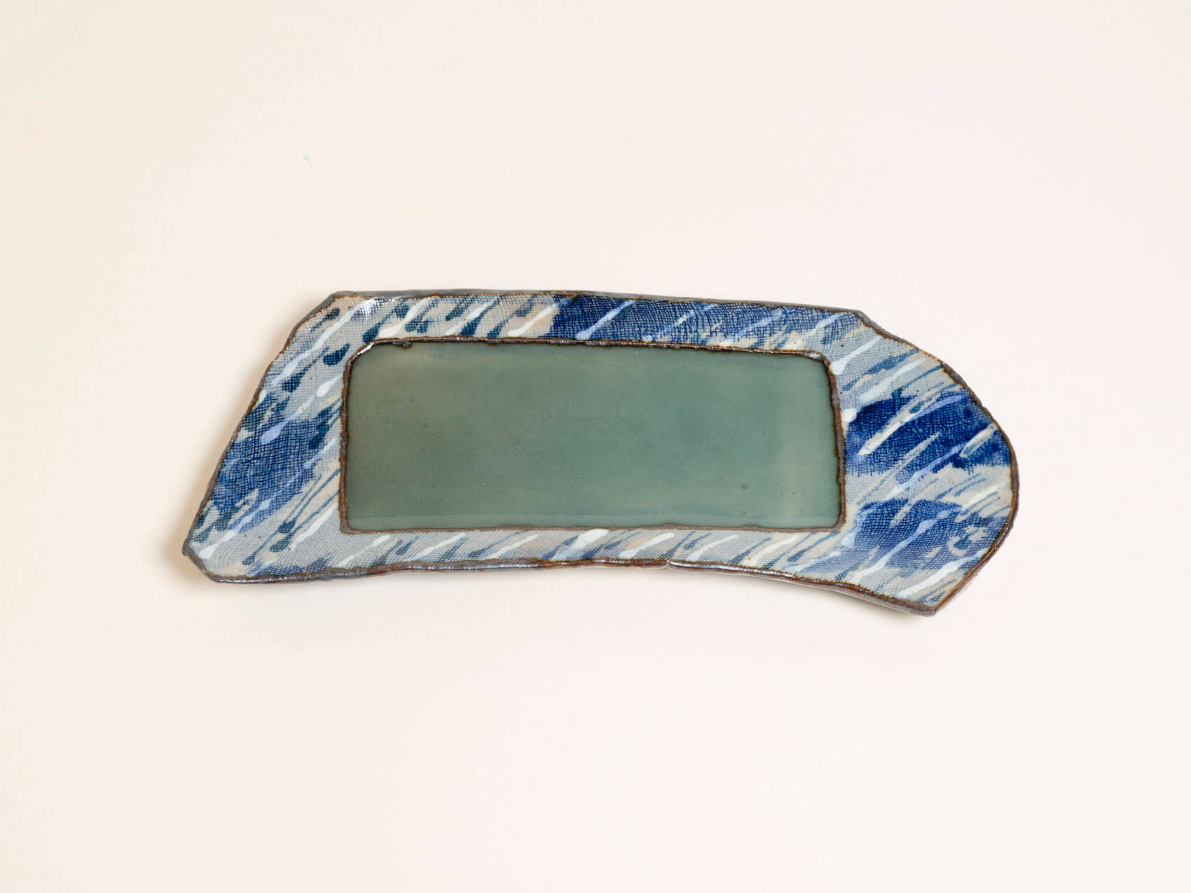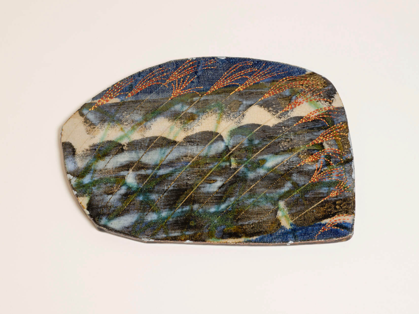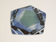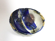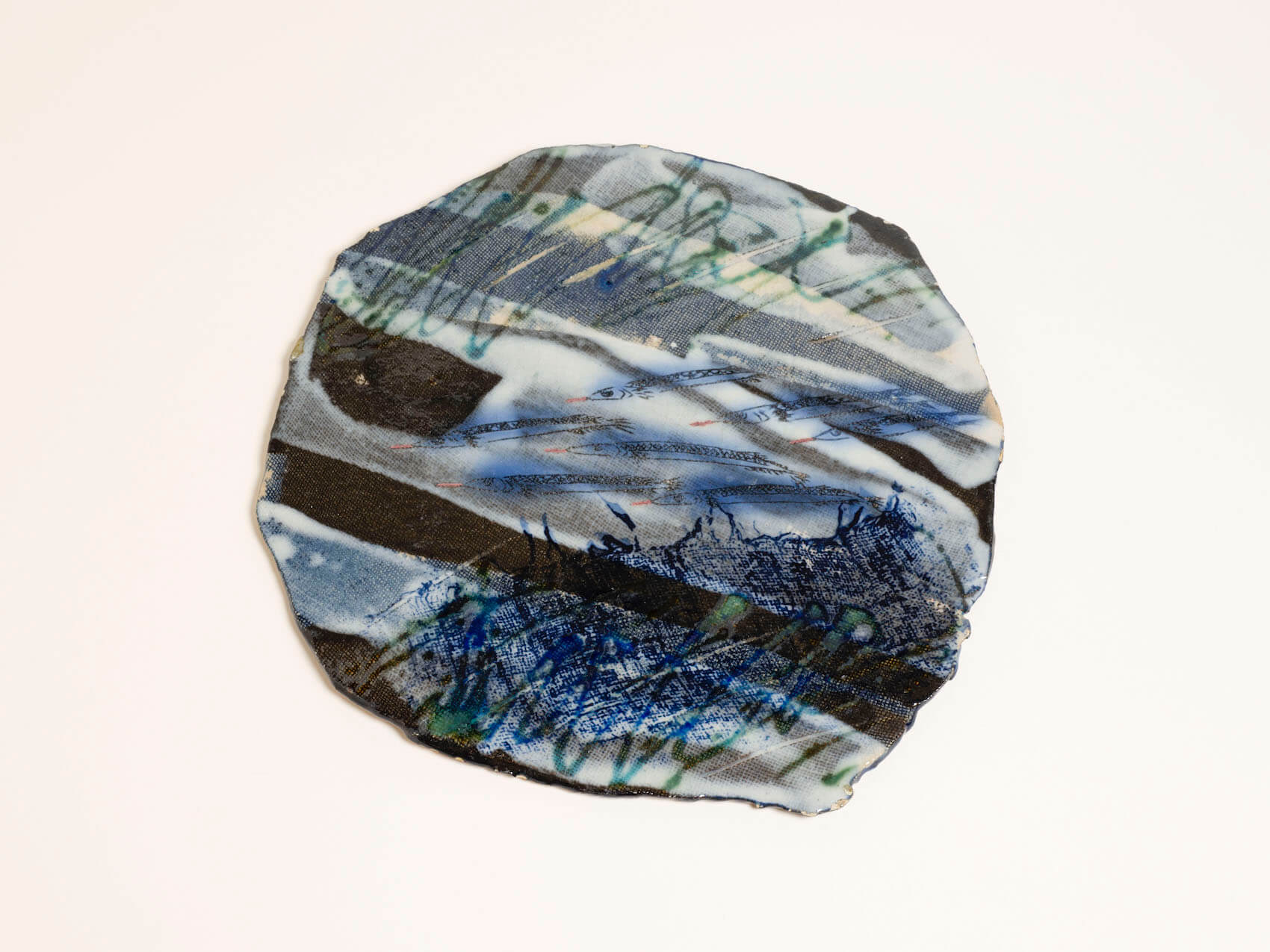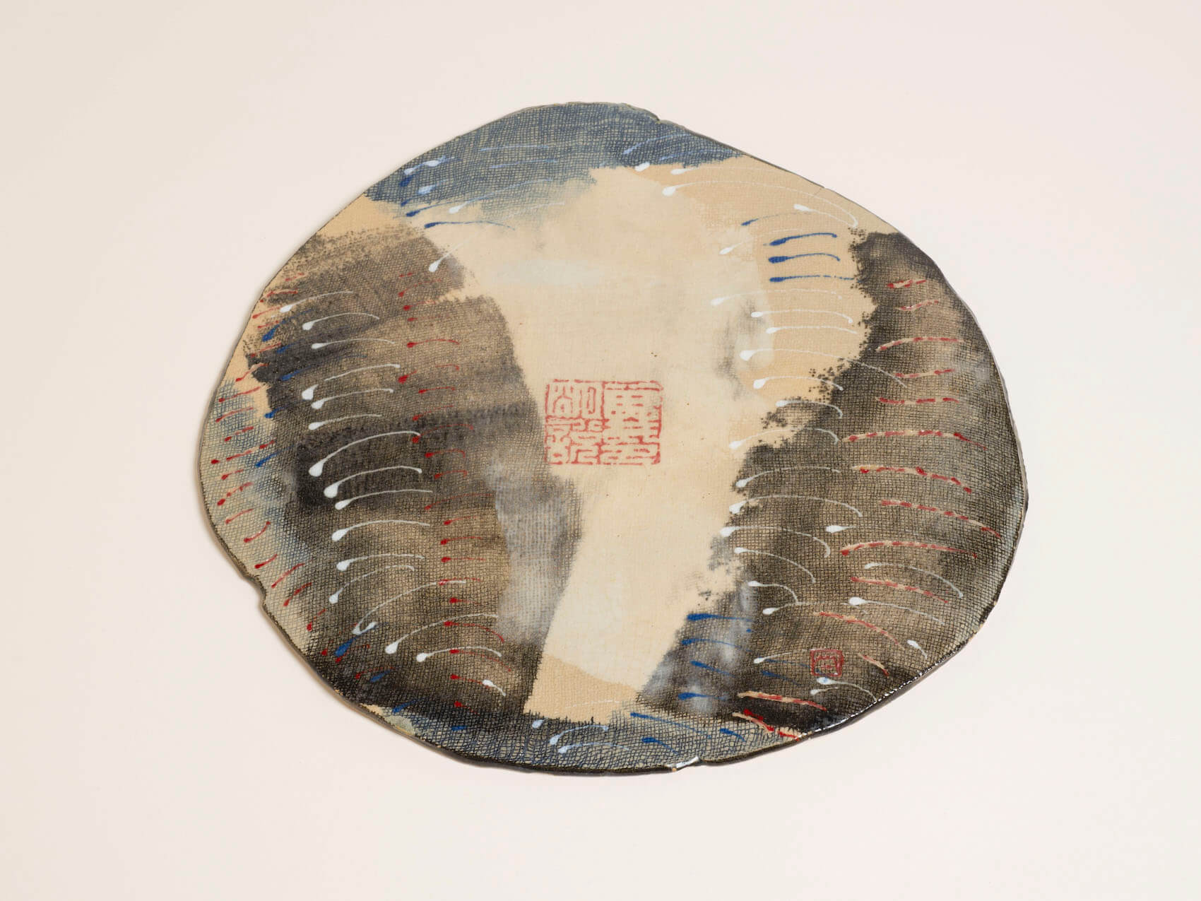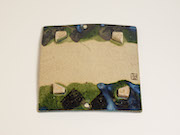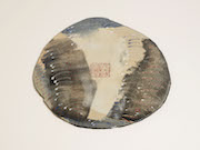山間流れ雲図、変形六角握り皿 23×23×0.4 タタラに切った土を、握り皿の大きさに気ままに切る。 布目を施し、鉄と呉須をそれぞれ勝手にローラーで刷き、呉須で色と線を入れる。 大小3カ所に島をになる空間を造り、透明釉を置き、水蝋で伏せる。 全体に鉄を濃いめに塗り、本焼き。 かなり色々と悪戯をしたのだが、黒、青、白、茶色が微妙に場所の取り合いをし、面白い図柄となった。