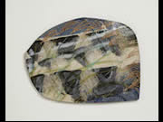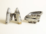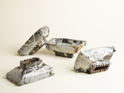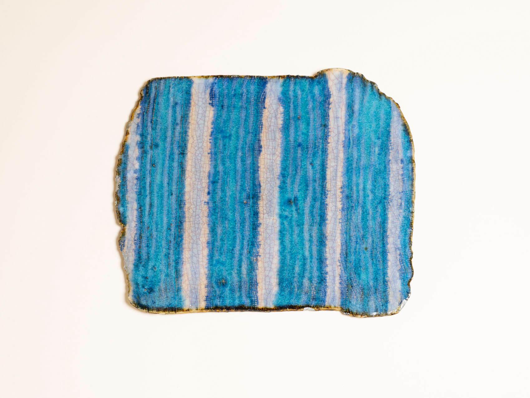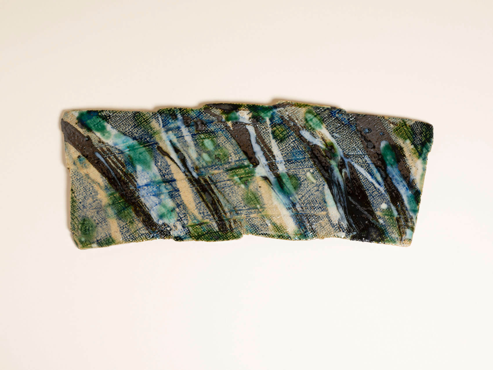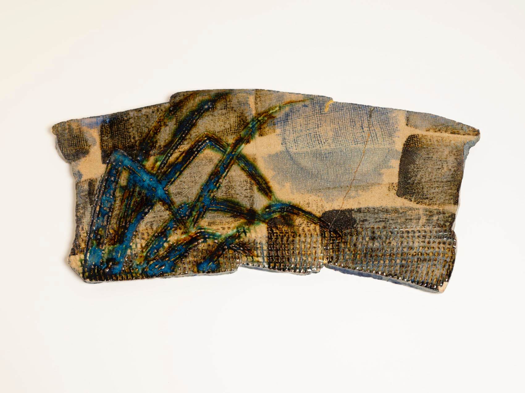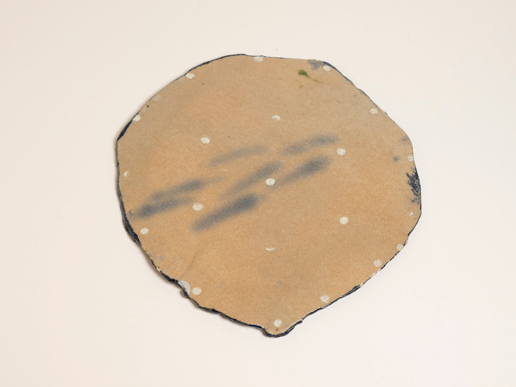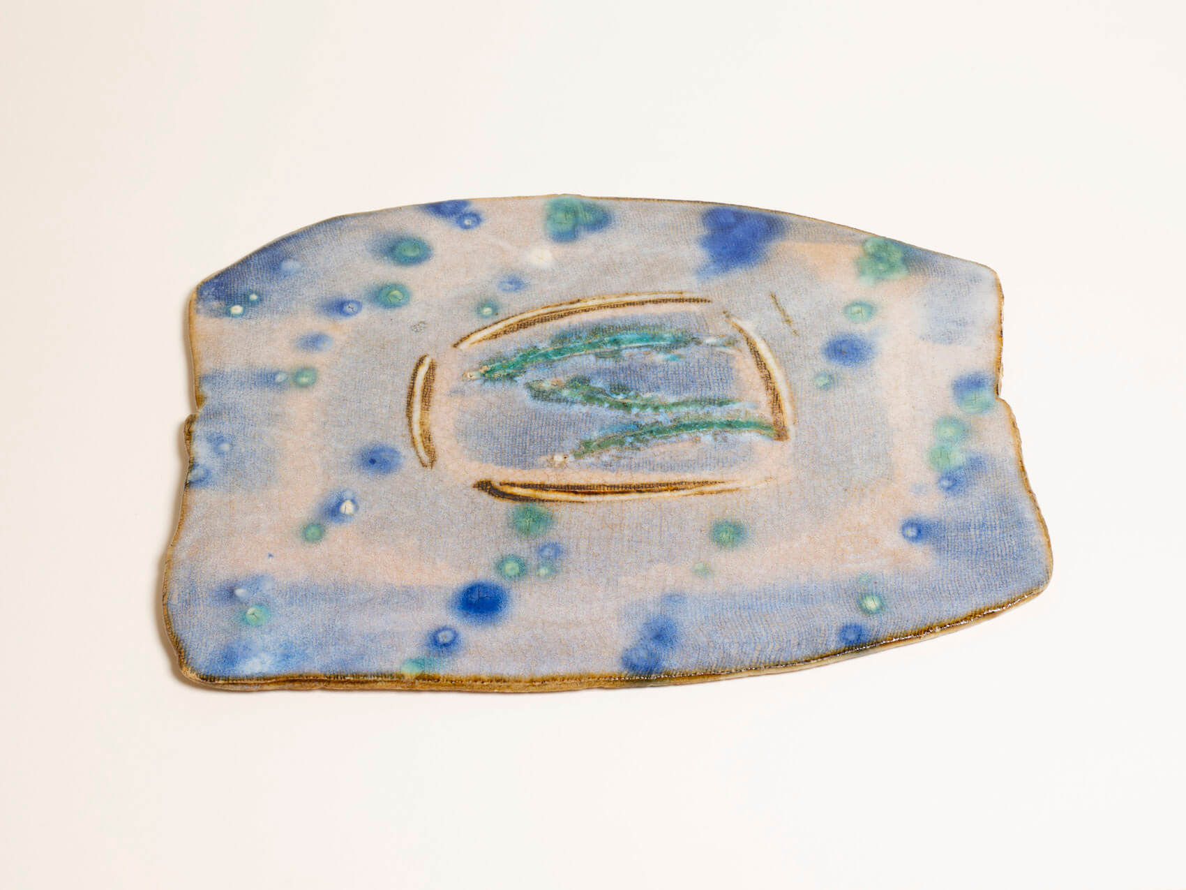 山間流れ雲図、変形六角握り皿 23×23×0.4 タタラに切った土を、握り皿の大きさに気ままに切る。 布目を施し、鉄と呉須をそれぞれ勝手にローラーで刷き、呉須で色と線を入れる。 大小3カ所に島をになる空間を造り、透明釉を置き、水蝋で伏せる。 全体に鉄を濃いめに塗り、本焼き。 かなり色々と悪戯をしたのだが、黒、青、白、茶色が微妙に場所の取り合いをし、面白い図柄となった。
