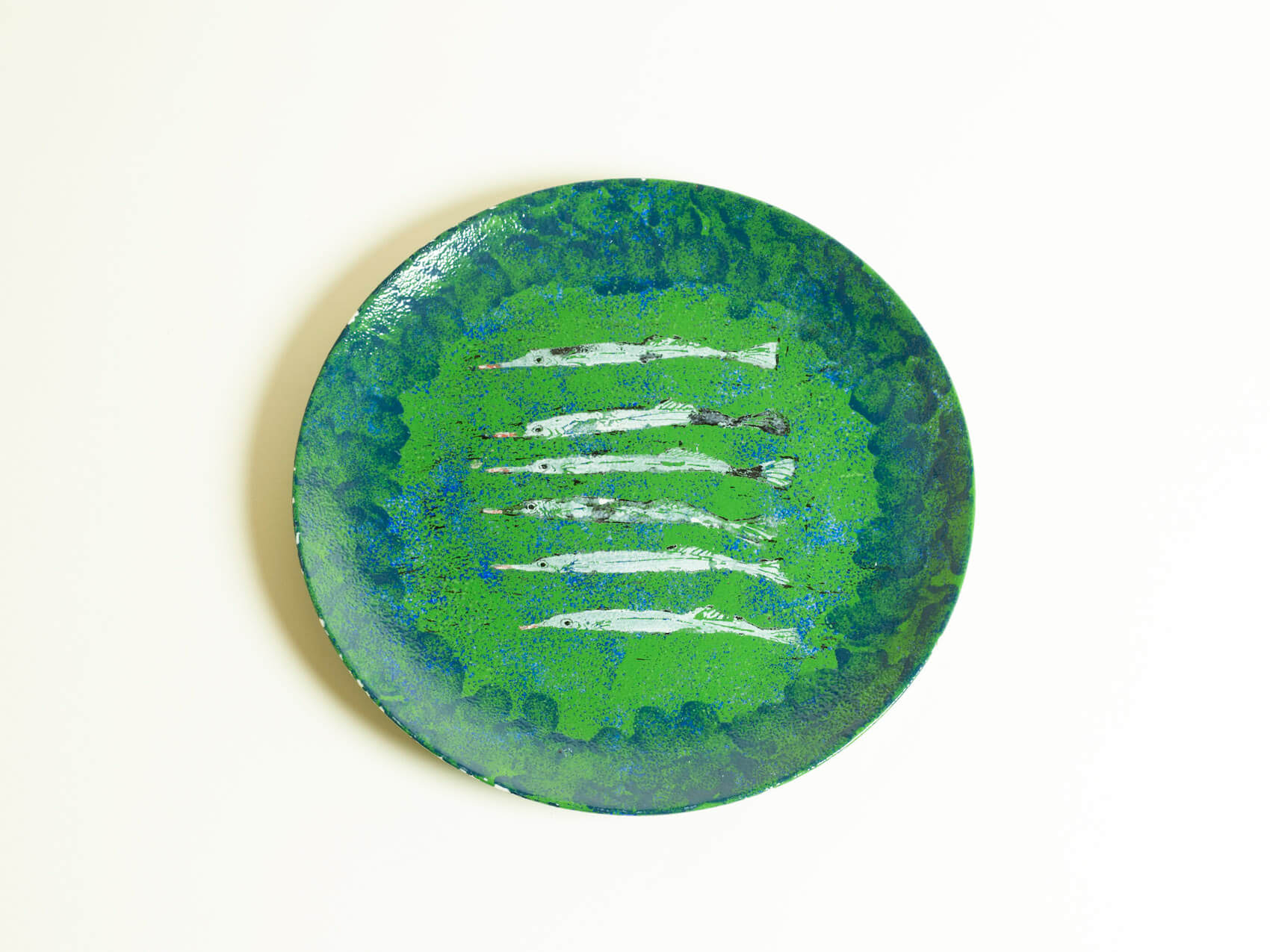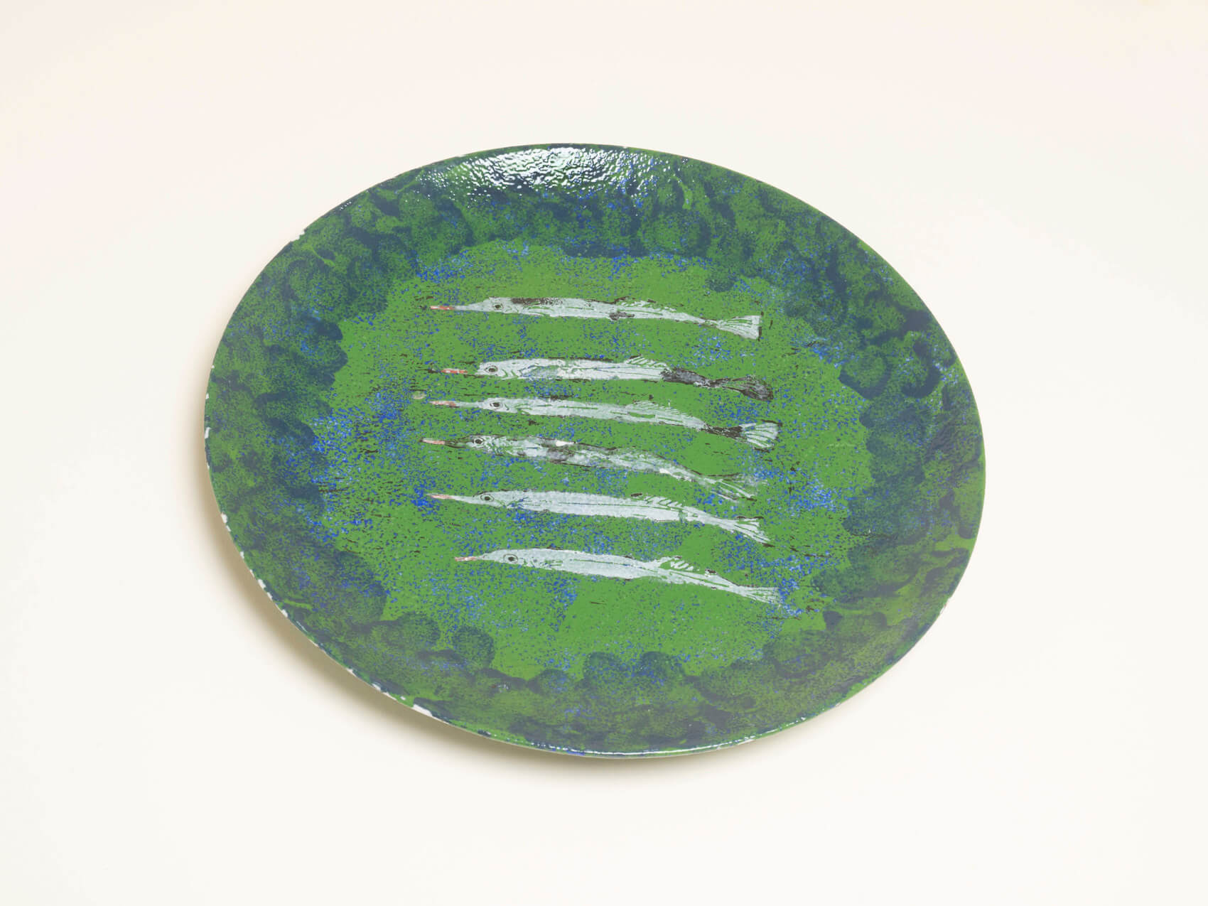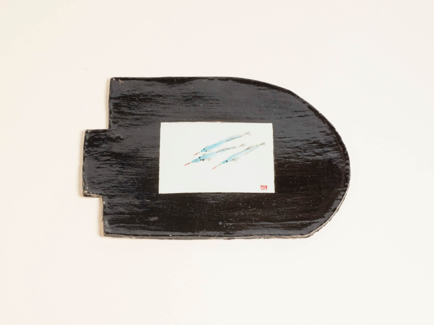 サヨリ、下絵付け握り皿 28×20×0.7 魚の型に切つた皿の中心に長方形の空間を抜き、周りを下絵の具の黒でたつぶりと塗り潰す。 空間を下絵の具の白で丁寧に塗り、乾燥させる。そこに三匹のサヨリを泳がせる。 長く伸ばしたくちばしの下顎の先端を薄っすらと紅に染めたサヨリは、江戸前鮨の世界では、粋でイナセな魚として、晩秋から冬にかけてを旨さの旬とする。