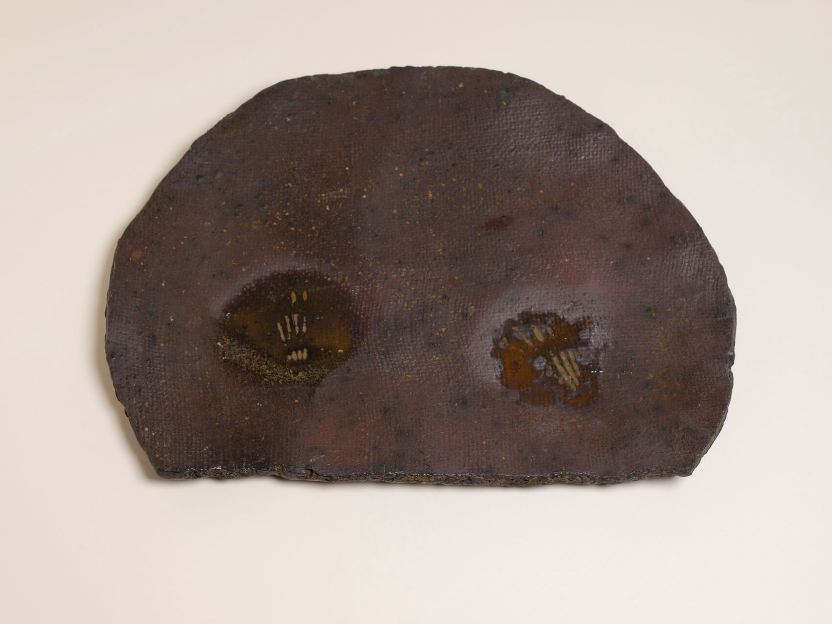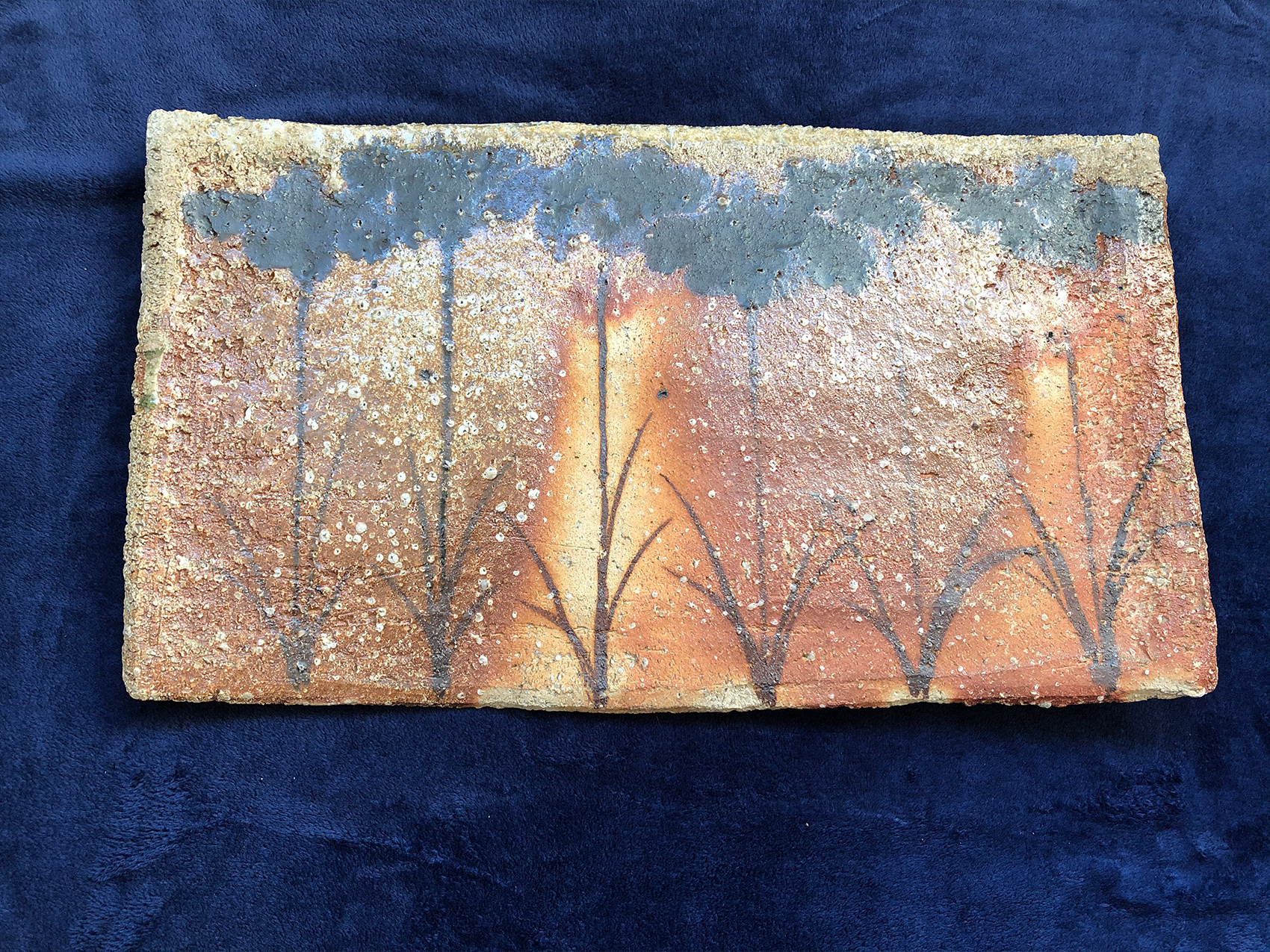 信楽焼き締め鉄絵握り皿 24×18×0.4 日本陶芸倶楽部の同好のメンバー約30人で信楽焼に挑戦した。 埼玉県にある穴窯で3日間の焼成。温度が上がらず失敗。 信楽焼の焼成は、アマチュアには無理とのことで、信楽の職人と再挑戦。 土も大事だとのことで、信楽のトップ作家である古谷道生氏の土を使わせていただく。 鉄で草花絵をのせる。 この火色の美しい窯変は、全て最高の土のお陰であつた。 使う度に嬉しさが増していった。