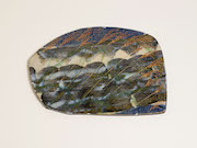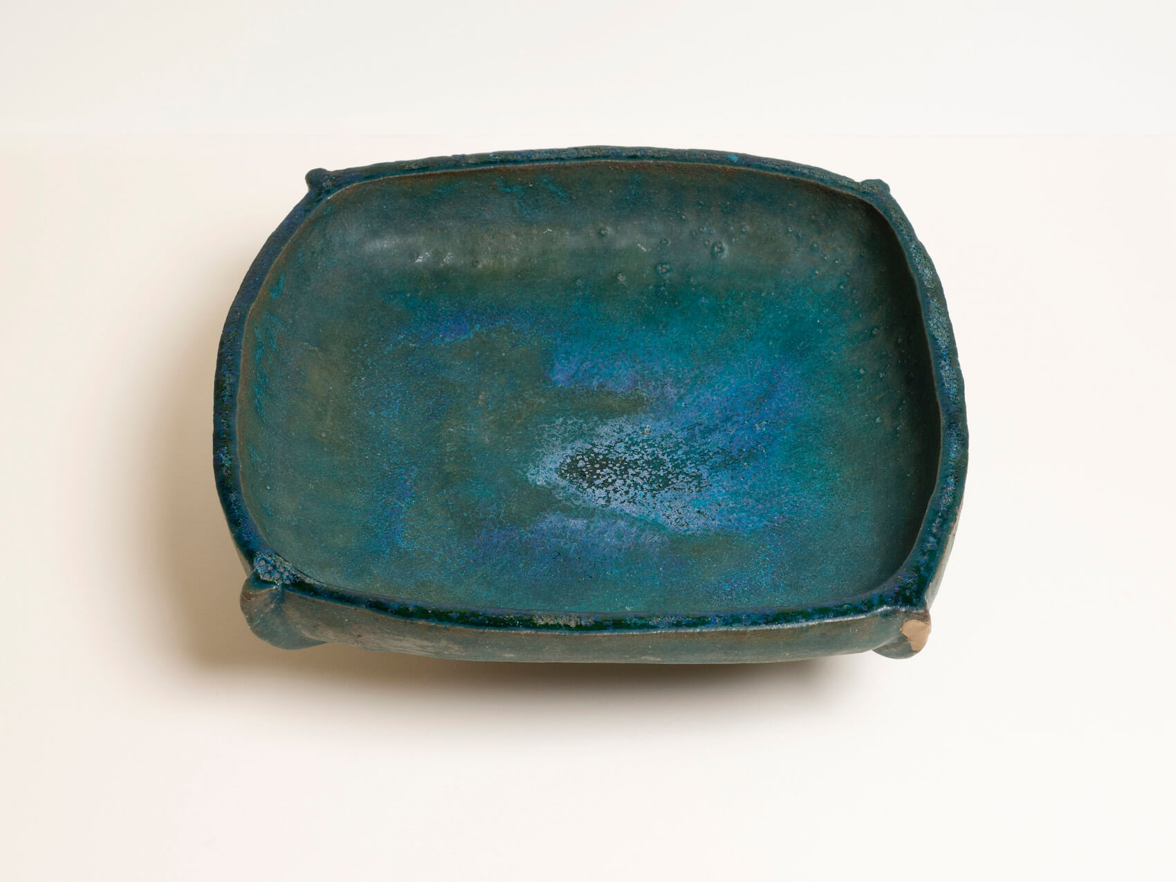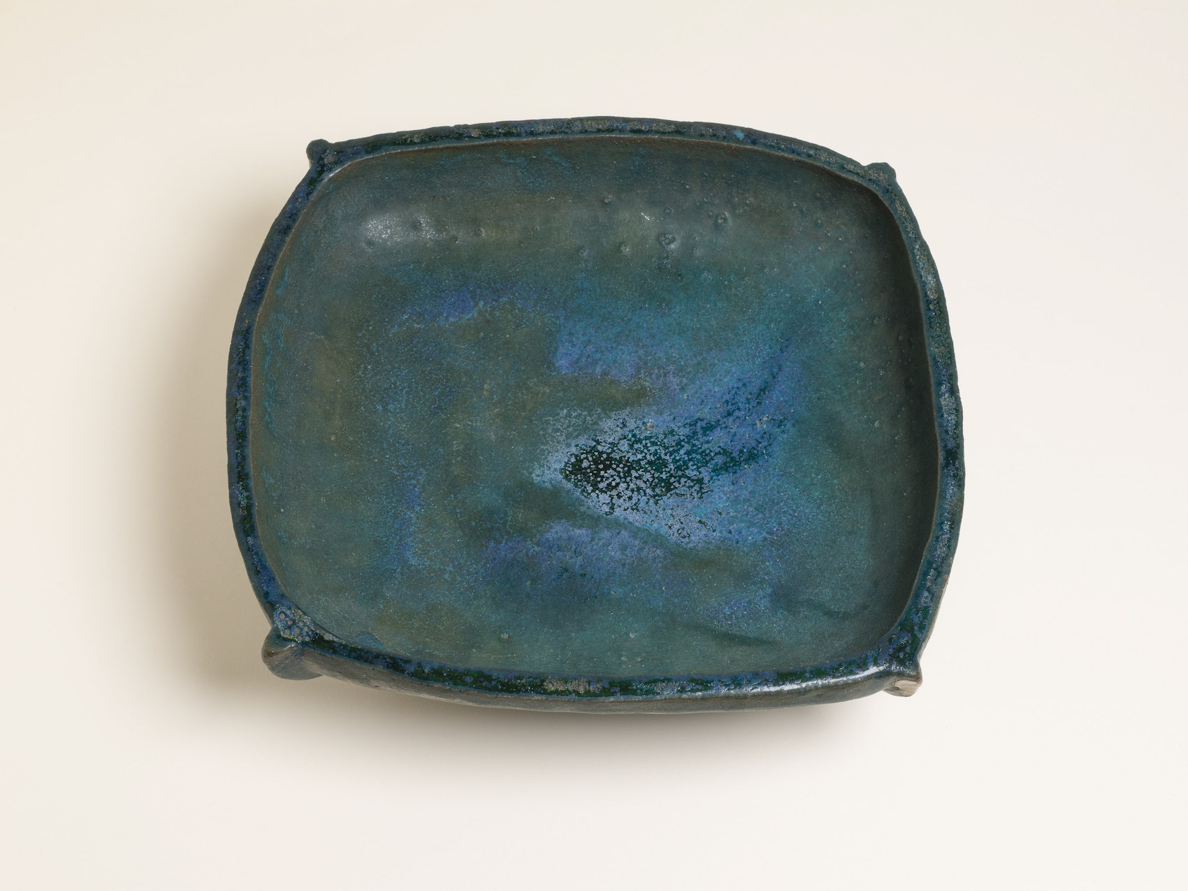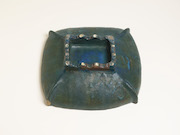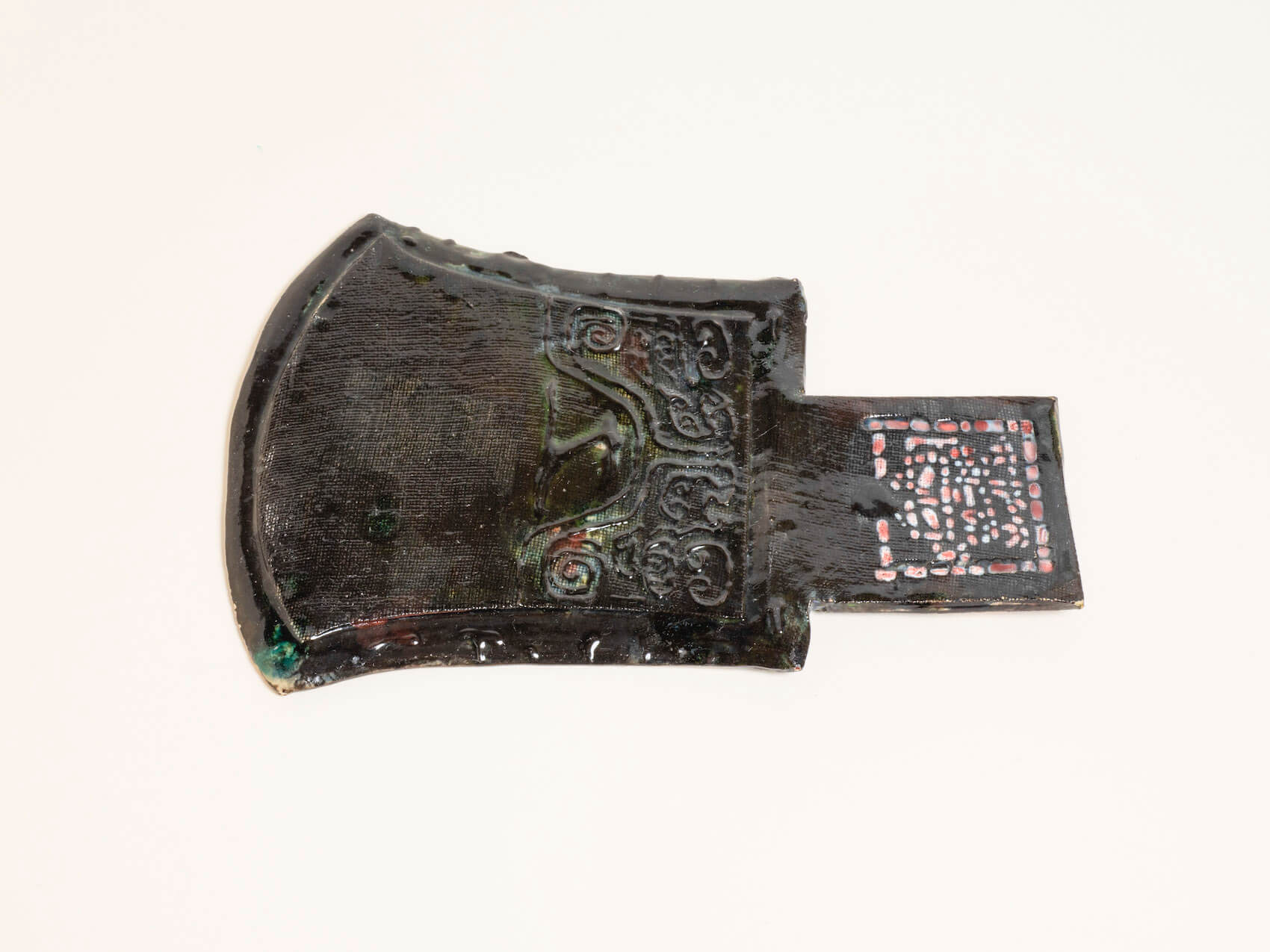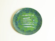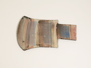 殷の青銅器、マサカリ写し、握り皿 台湾の故宮博物院の収蔵品が上野の東博にやつて来た。 その中に、中国古代王朝、殷の青銅器のコレクションがあつた。 青銅器は殷の時代に最隆盛期を迎えたと言われる。 その異形で壮麗な数々の片隅に、ひっそりと小さな青銅盤が立て掛けてあった。 狩に使うマサカリの形で、持ち手の部分には玉が象嵌されていた。 祭事に用いられたと言う。 微かに緑青が吹き、3000年に及ぶ歳月は、小品ながら、静謐さの中にも堂々と異彩を放っていた。感動であつた。この形、この色彩を皿に写そう!。 一心不乱、色合いはかなり変化したが、嬉しい出来となつた。
