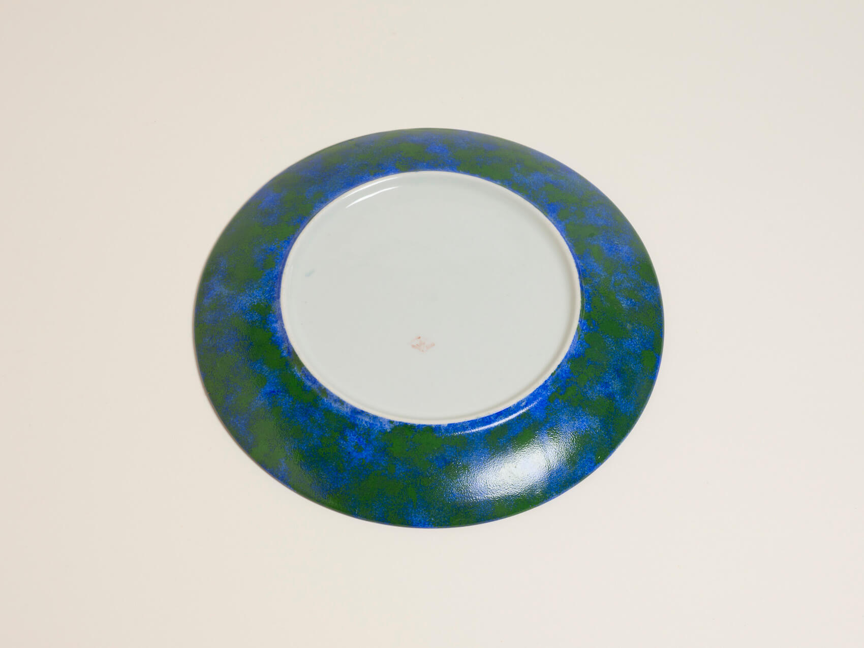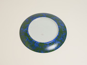 本焼きし、緑に塗られた丸皿の外側に、青色をスポンジで置いて行く。
