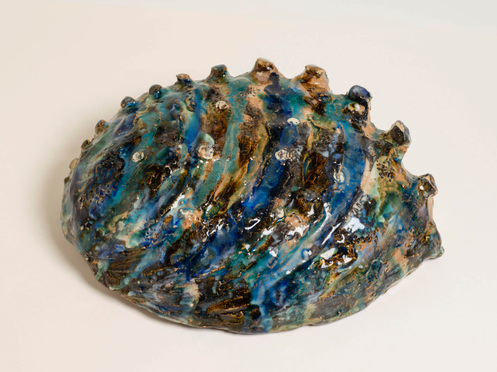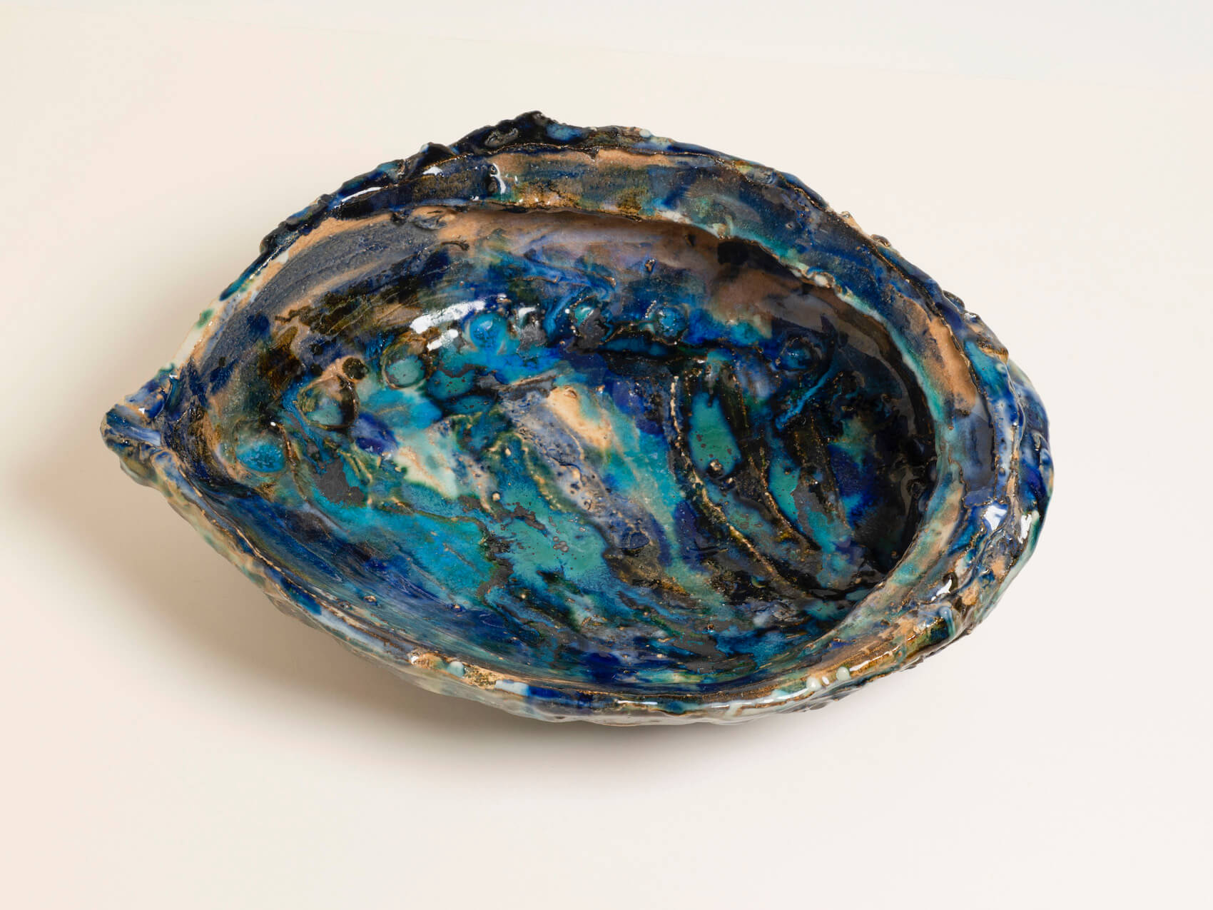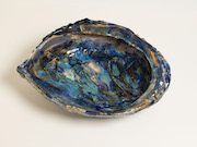 特大マダカ鮑(あわび)大鉢 35×25×10 北大路魯山人が大原の特大マダカ鮑のビワっ貝の素晴らしさを書いている。 面白い、鮑はこちとらが専門だ。 じゃぁ、その特特大のヤツをやってやろうじゃないか。 一大挑戦だった。 大量の土を練り、長方形に叩き出す。 後はたゞひたすらに彫って彫って彫りまくる。 最後にマダカ鮑特有の大きく高い角を付ける。 重い! 素焼き。 呉須、トルコブルー、鉄、織部釉と、何が何だか、ひっちァかめっちァか塗りたぐる。 重いの何のって、超特大マダカ鮑が二ハイ出来上がった。 重厚で華々しいのだが、なかなか出番のない器であった。