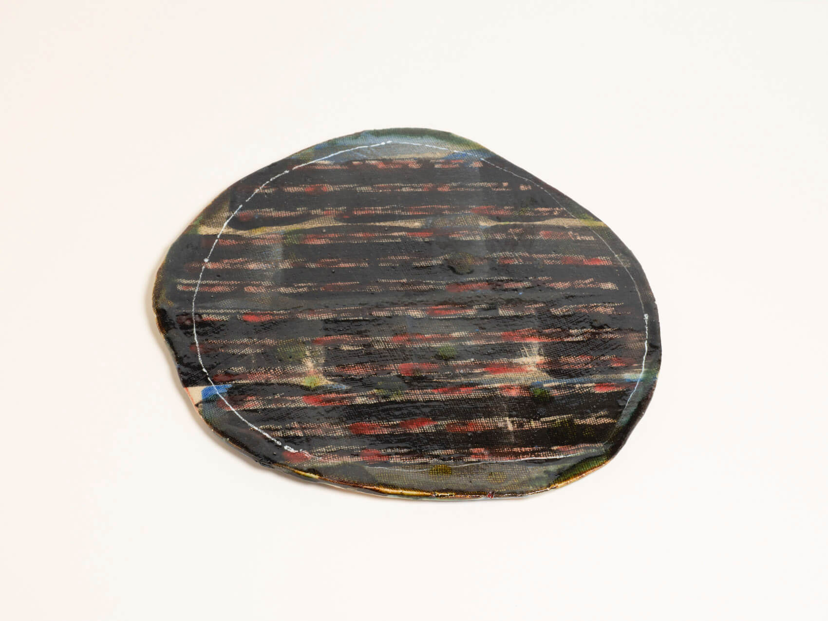 今回はザックリと長形に切り、布目を細かいのと粗いのとで二分に押し分け、織部釉で草を、月は染め付けで朧月だ。