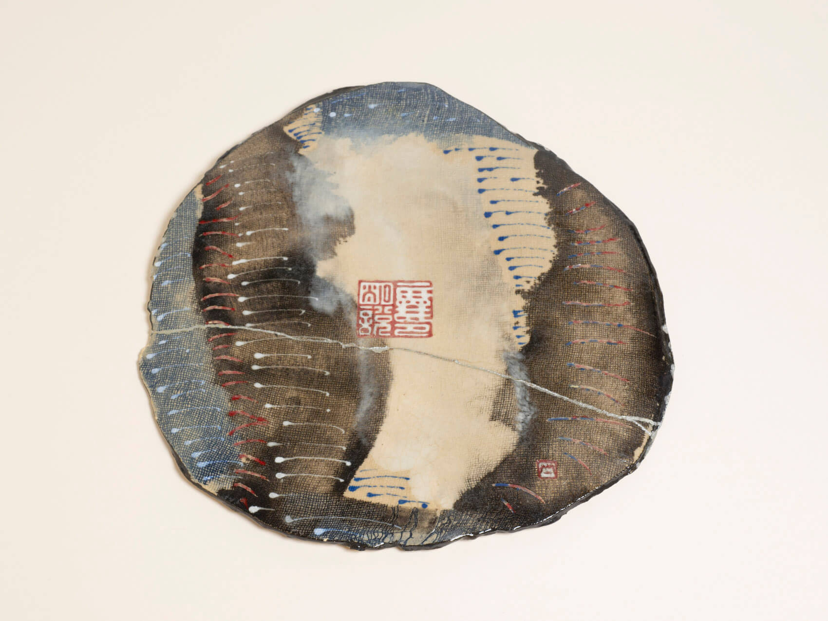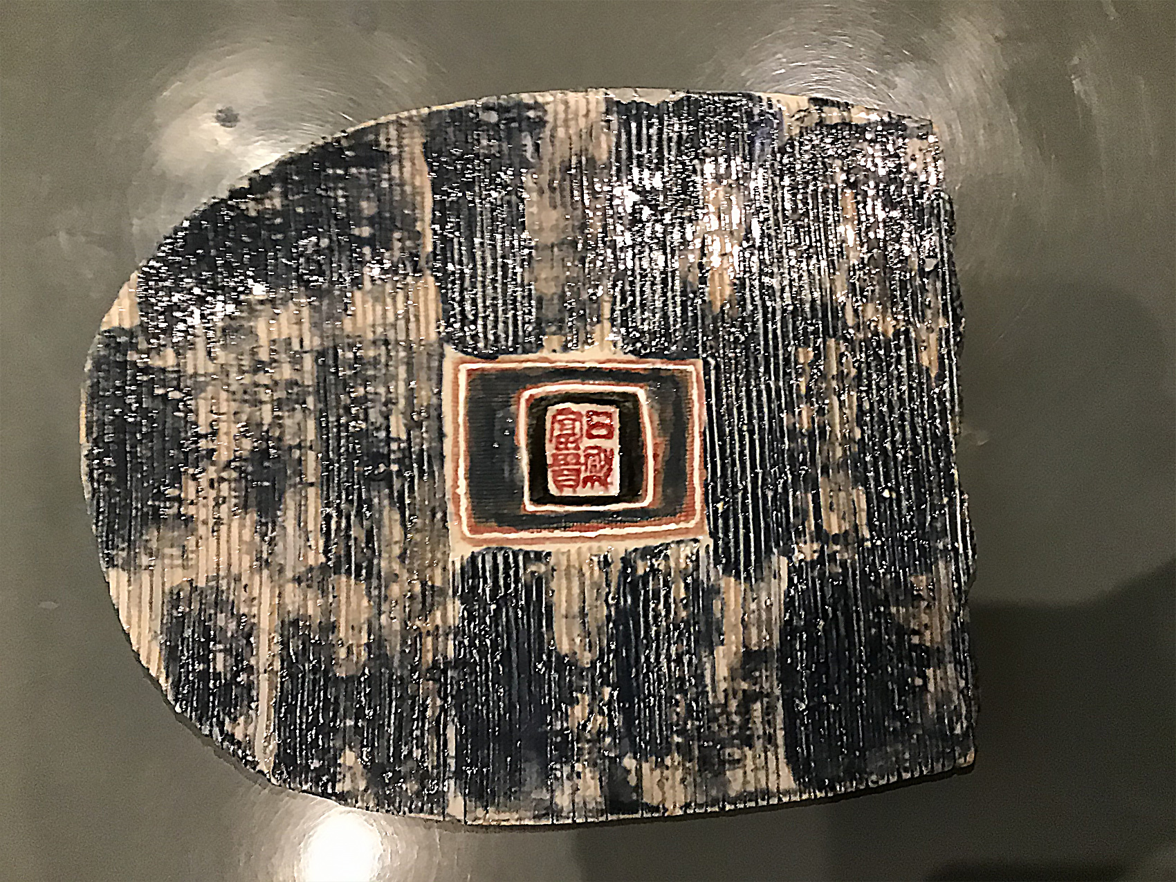 下絵付け篆刻印刺身皿 29×30×0.5 この皿は、同時に二枚作成した。 焼き物は、同日同時に二枚作っても、なかなか同じ様には上がってくれないものなのだが、この時は、一枚目の仕上がりが、かなりの手応えがあったので、直ぐに同じような色付けをして追いかけたのだったが、出来上がりは、ちゃんと発色の違いが出て、面白い皿となっていた。 真ん中に押した篆刻は、白文の傑作として知られ、すごく気に入っている。 地の白と印泥の朱色が見事に美しく出てくれて、感動ものだ。 黒化粧も、靄った雲の様な白化粧も、染め付けまでもが美しく発色してくれた。陶芸をしてて良かったなぁと、つくづくイイ想いにさせてくれた作品だった。 長年の使用による割れを銀継ぎ。