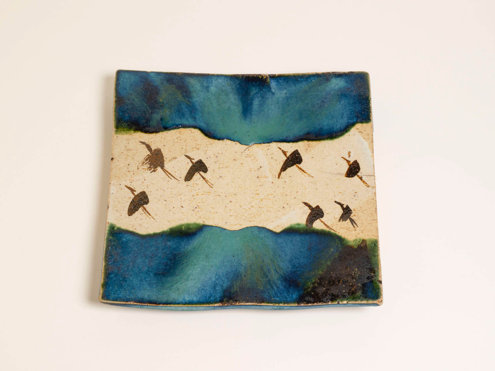 飛翔鶴、絵織部角中皿 裏面 24×24×2 角皿の両端を大胆に、どばっと織部釉に漬け込む。 釉薬が流れ、大海の波ように押し寄せている。 その波の狭間を二組の鶴の親子が二羽三羽と飛翔してゆく。 凄く好きな皿で、二人用の刺身皿として重宝に多用した。