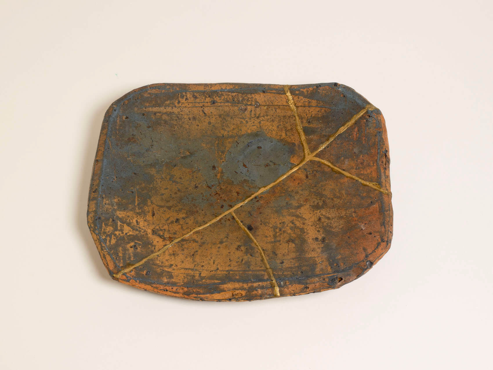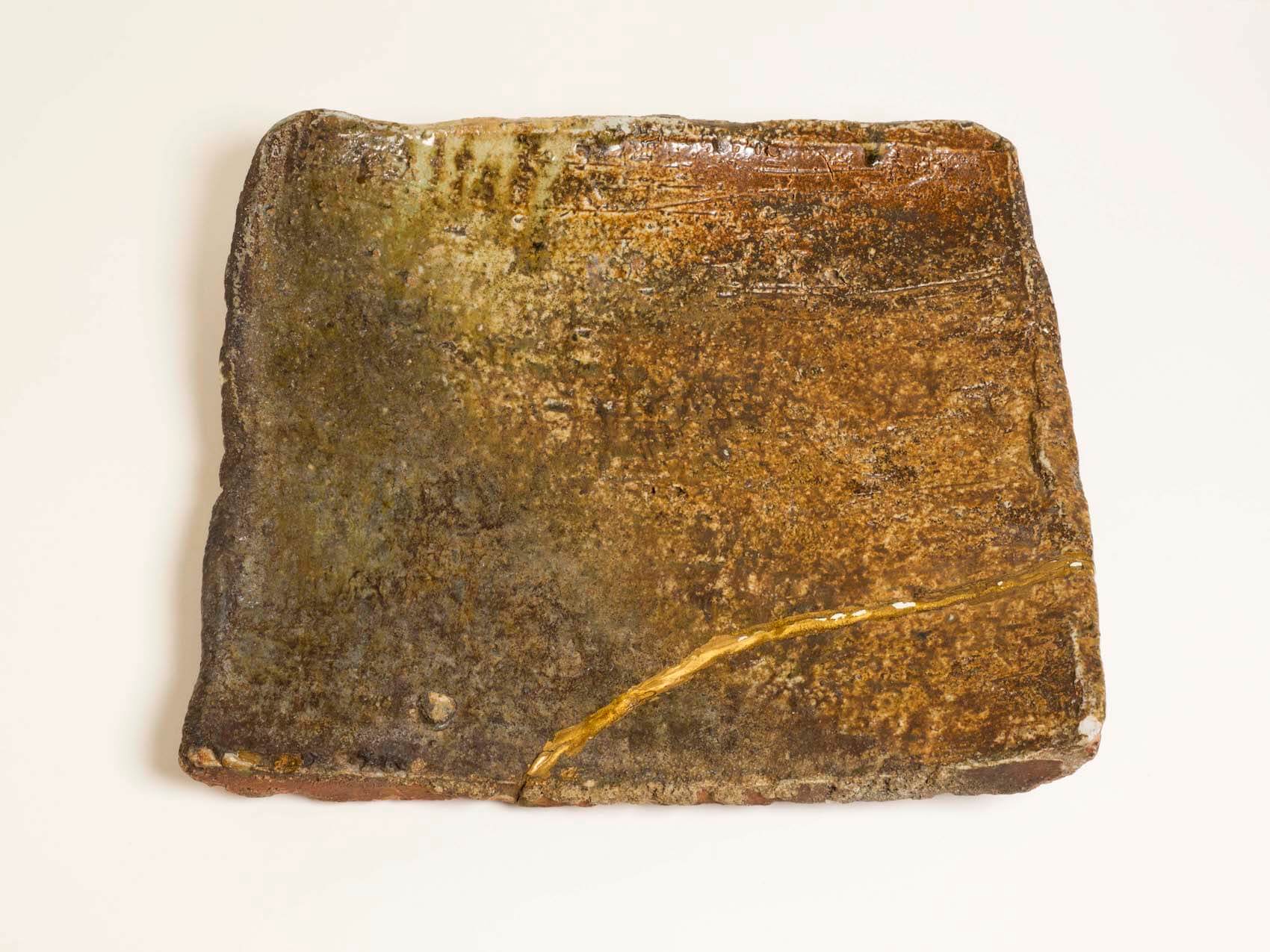 南蛮焼き締め刺身皿 28×21×2 南蛮焼きを追い掛ける作家、山本安朗さんの工房での、僕の最初の作品だつた。 滋賀県栗東の土を練って厚めに叩き出し、四隅を切り、狙いの形にただ一心に削り出してゆく。 人工の釉薬は一切なし。素焼きもなし。 乾燥後、穴窯に入れ、薪で3日間焼成。薪での焼き締めの出来は、窯詰めと焼成の技術に大きく左右されると言う。 黒茶褐色の発色と丸いぼた餅の遊びは、作家の技術と好意によるものだつた。 狙った厚みと重さからくる重厚さは心地良く、初めての南蛮、感動いっぱい、満足満足であつた。 後に破損、金継ぎにより、さらに風格も出てきた。
