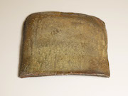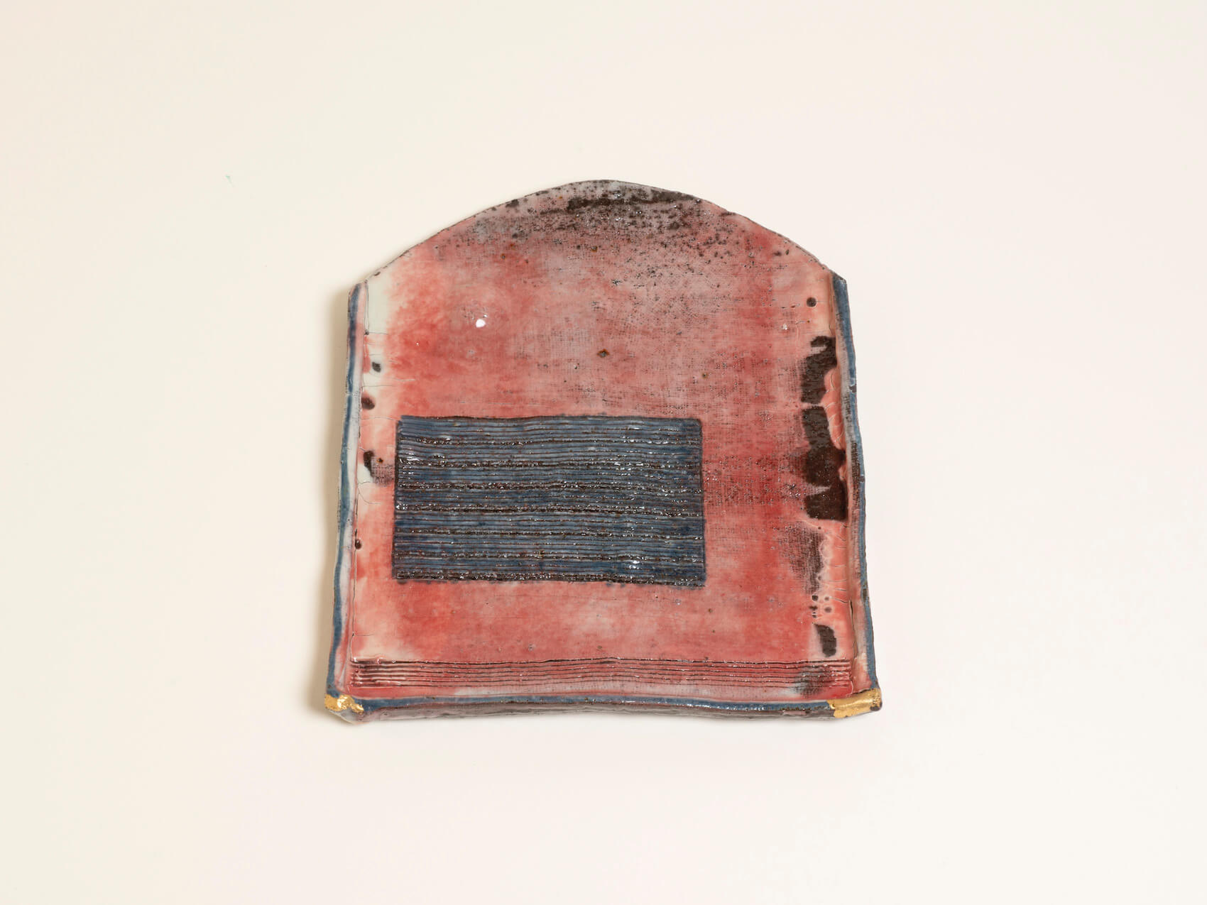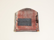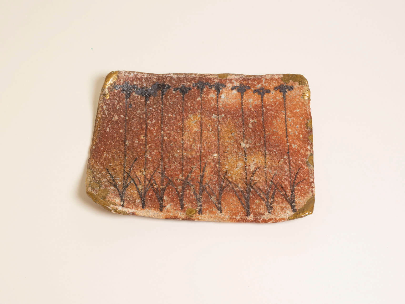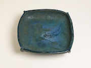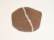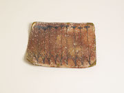 南蛮塵取り形下絵付け握り皿 22.5×19.5×2.0 南蛮焼きに使う栗東の土を塵取り様に切り、下絵付けの赤を薄く乗せる。 脇に長方形の窓を付け、極細の線を彫り、灰色を入れる。 なんか妙な皿の出来上がりになった。 鉄分の多い赤土がチラチラと顔を覗かせていて、個性的で面白いじゃないか、と気に入って使っていった。