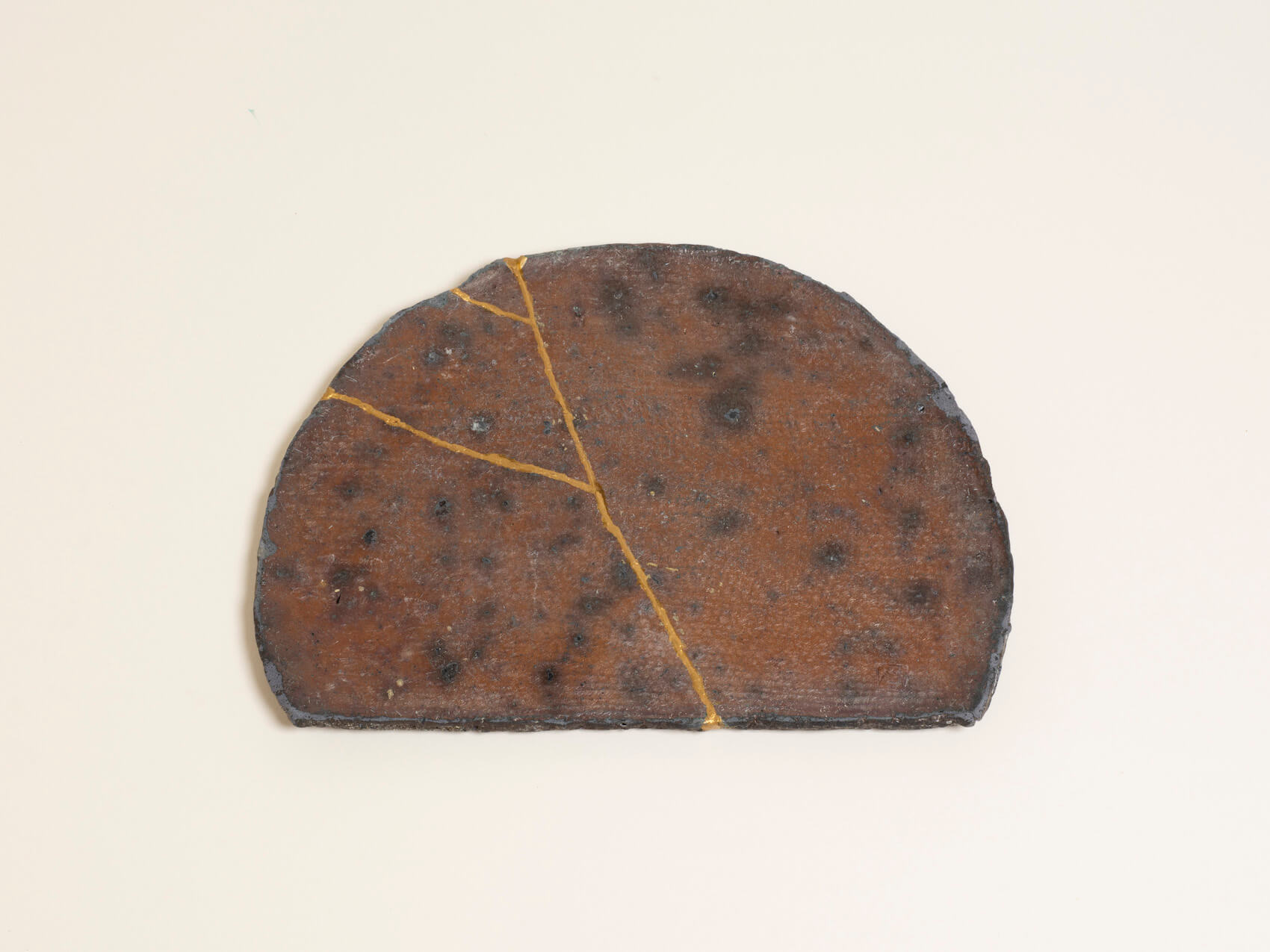 南蛮焼き風井戸茶碗写し②11.5×9.2 ①で前述の井戸茶碗写しの高台だ。 金継ぎが美しく、古色の器に映えている。