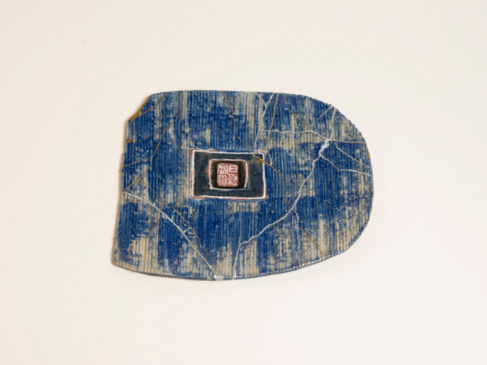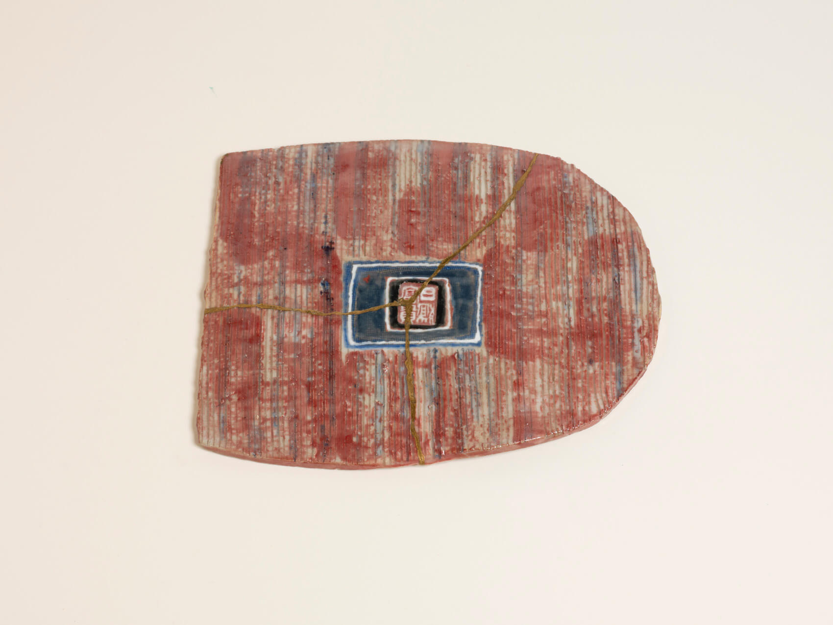 下絵付け篆刻(てんこく)印握り皿 23×19×0.4 楕円の一方をいい調子に切った皿の表面に、細く細く線を掘る。 皿の真ん中の一部を平らにし、2年ほどやって気に入った自家製篆刻印を押す。 平筆で下絵付けの赤と青を落とし付けてゆく。 薄く0.4㌢の厚さに切った陶板は、如何にも繊細で好ましいのだが、それ故に破損と欠落を生じさせ、いく度かの金継ぎと銀継ぎの目に合いながらも、大切に使ったのだった。