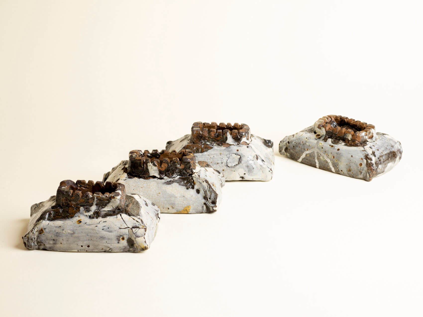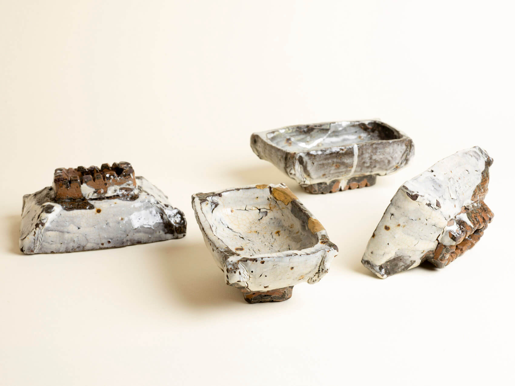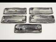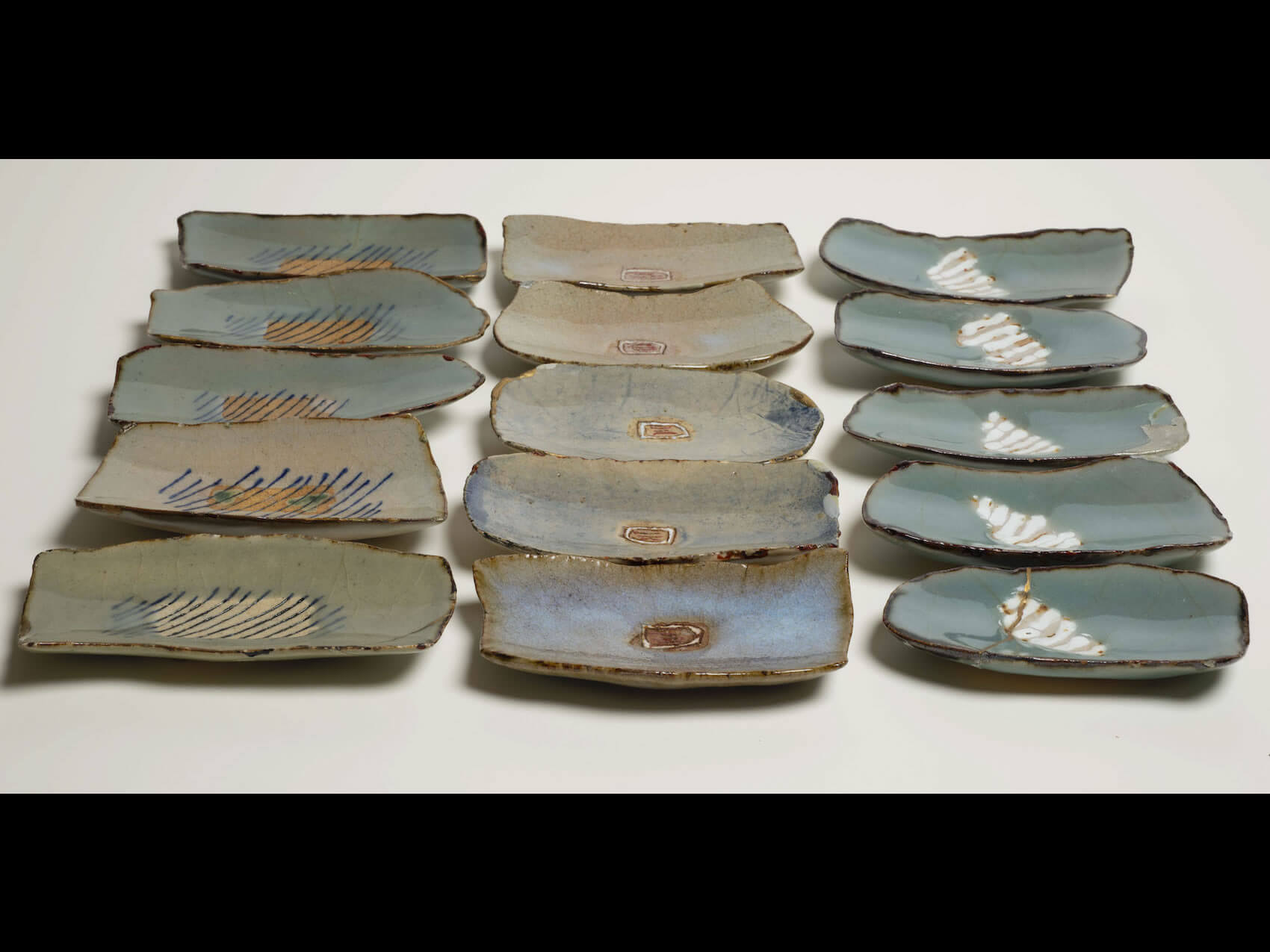 叩き出し長形お手塩各種 12×4.5×2 石膏で、丁度良いカーブを持つた凸の型を見つけた。 土を少し細長く丸め、型の上で叩き伸ばしてゆく。 余計な部分をナイフで切り、その部位をまた叩く、を繰り返しながら、形にしてゆく。 口辺に思いもよらないイイ形が現れ、その連続で、一つの形にする。 結果、それぞれが面白い形に変化し、つい夢中になり、気がつくと10ケほどが軽く出来上がっている。 最後に可愛らしい脚を付ける。 本邦初の、長山一夫独自のお手塩皿の出来上がりだ。