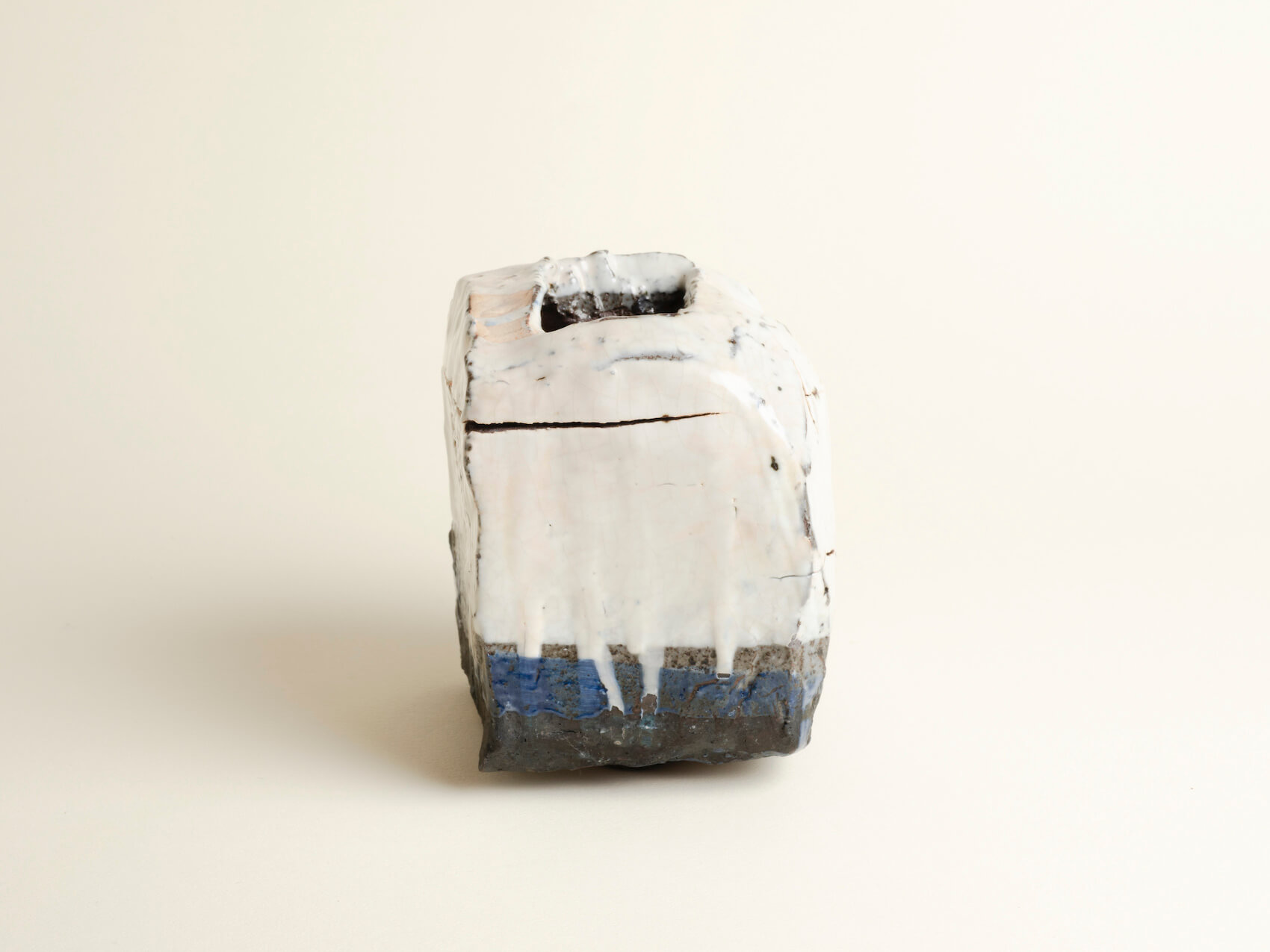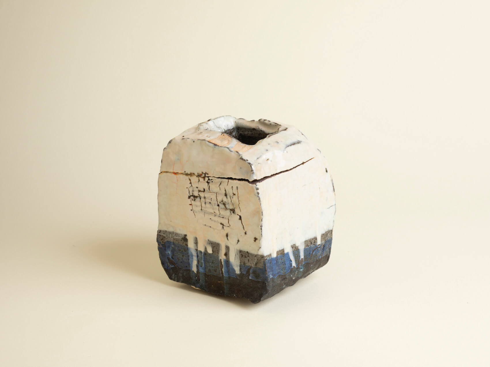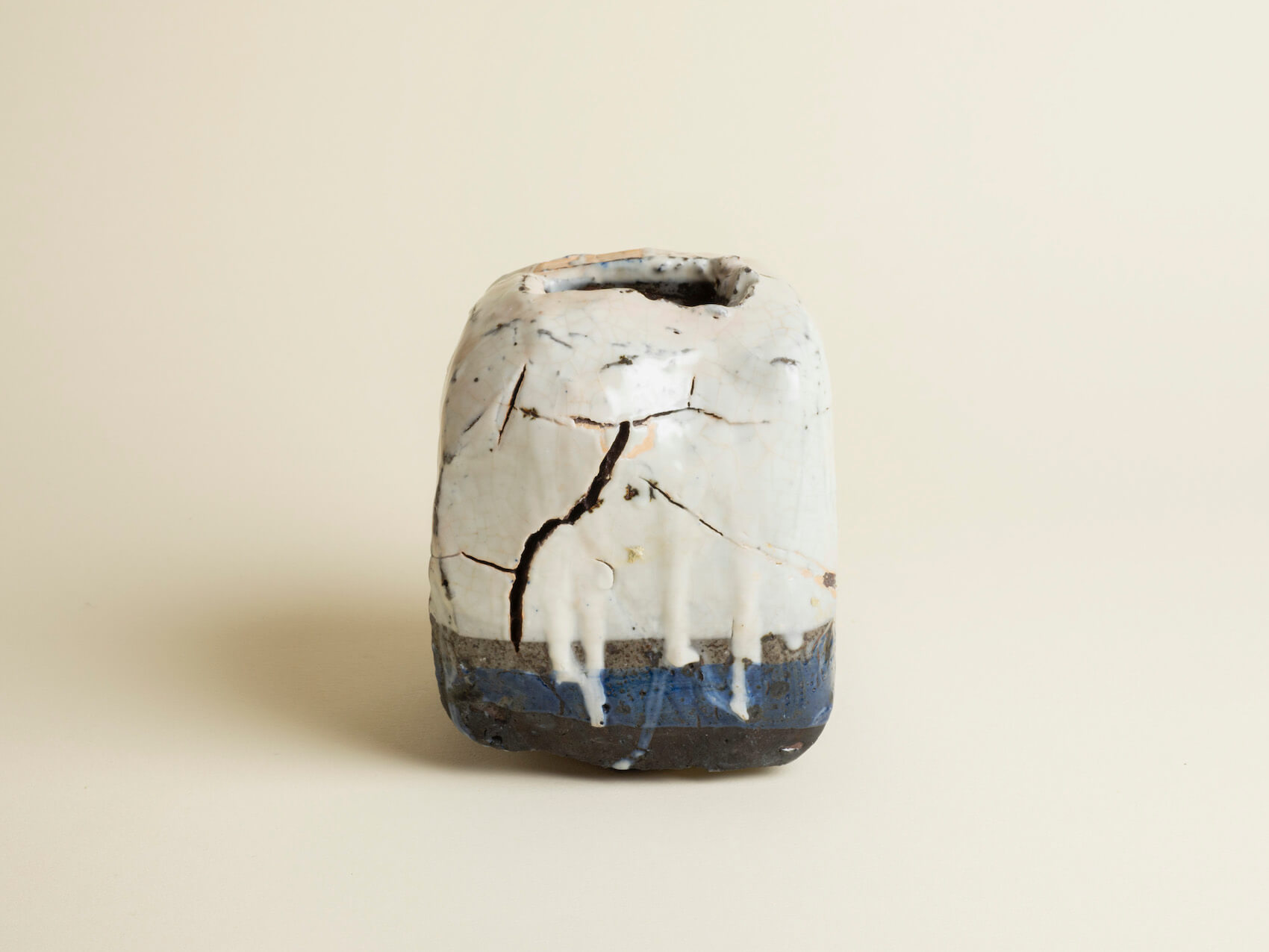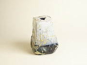 粉引き花器 10.5×8山本安朗さんの栗東の土で、粉引きの花入れを作る。 土の塊を削り外形を作る。 首の部位を水平に切り離し、2個の土塊にする。 上下をそれぞれに掘り削り、切り口を又貼り合わせる。 上部に口を開ける。 下部に呉須を塗り、上部にたっぷりと白化粧を生掛けし、一部に傷を入れる。 本焼き。上下に貼った箇所には横に、他の部位にも気ままな窯割れが入り、たっぷりの白化粧の下から鉄分の多い土肌が覗き、面白い景色となった。水漏れを塞ぎ、野の花を投げ入れた。シメシメだった。粉引きは野の花と相性がいい。