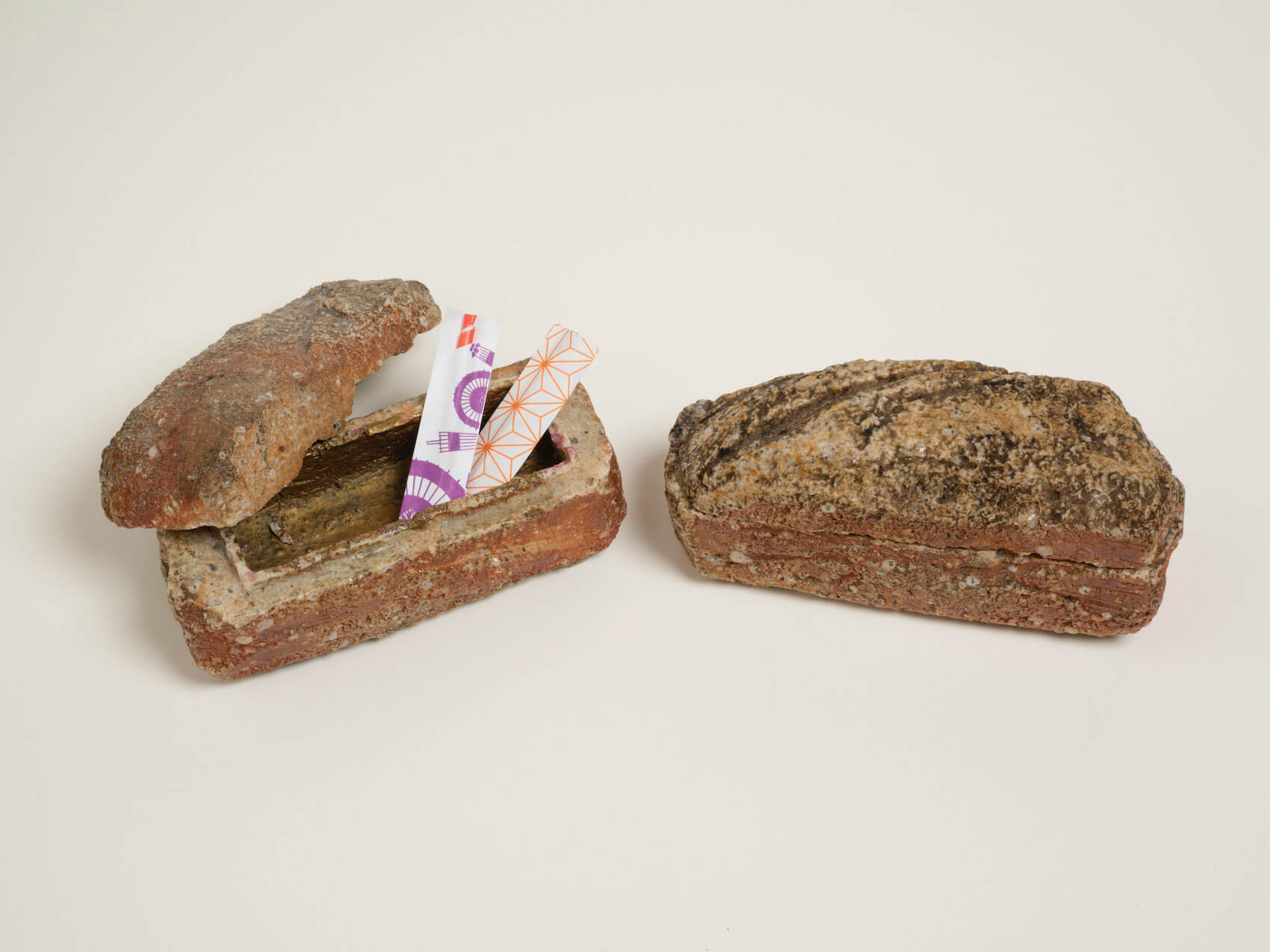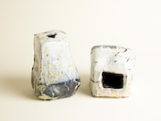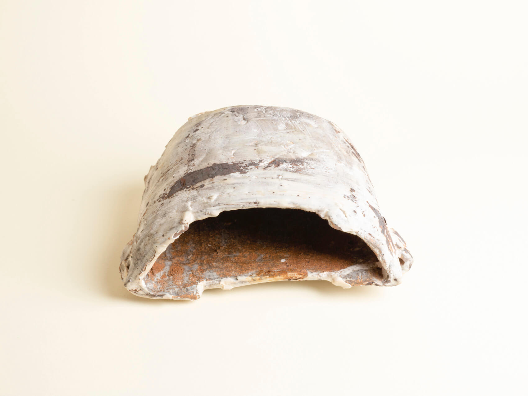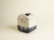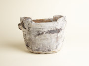 南蛮耳付き粉引き偏形花器 25×8×15 鉄分の多い南蛮の花器に耳を付け、部分的に弁柄をラフに刷き、その上に白化粧を全体に刷毛で塗り込める。 無釉薬のまま本焼き。 無釉薬が南蛮の枯淡な味を引き出し、面白くさせた。 白化粧の下に浮かぶ弁柄と成形時の傷跡が、器形と妙に相性良く、好みの花器となった。
