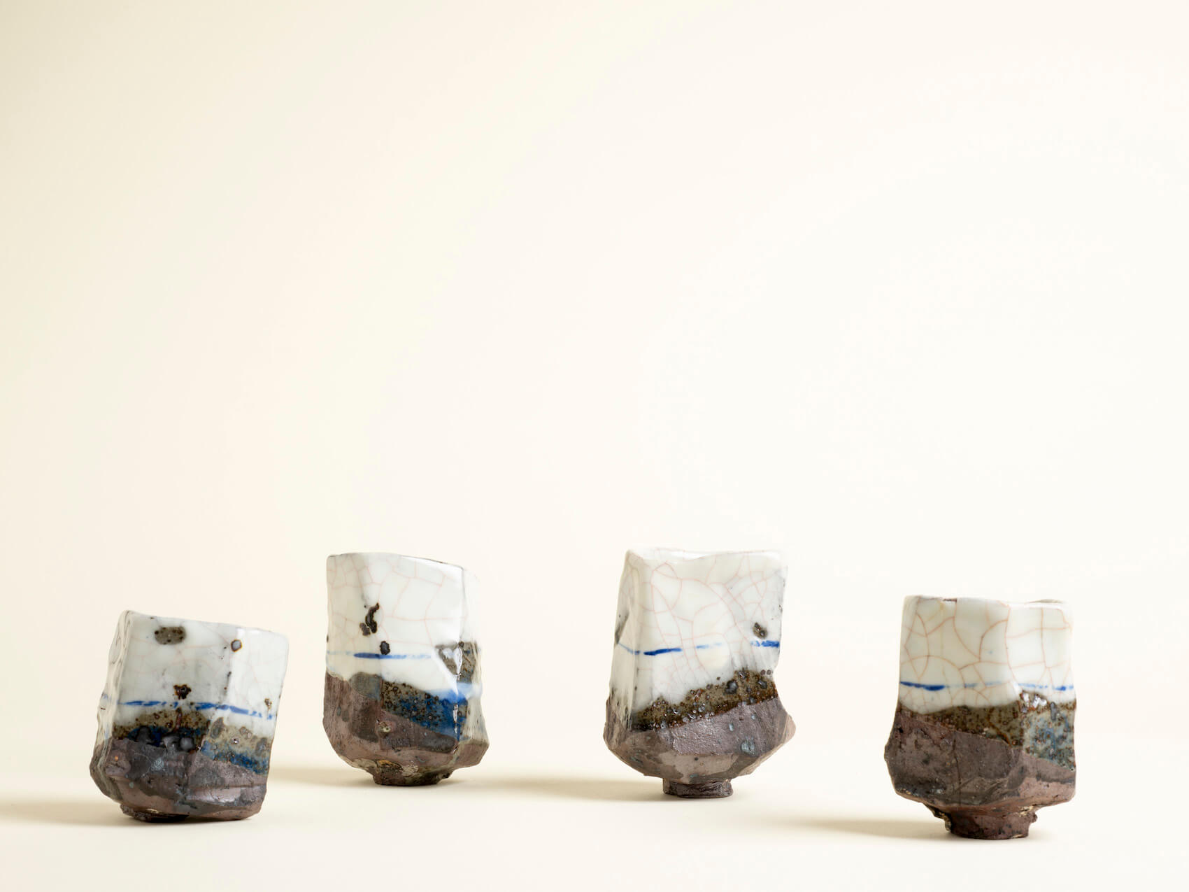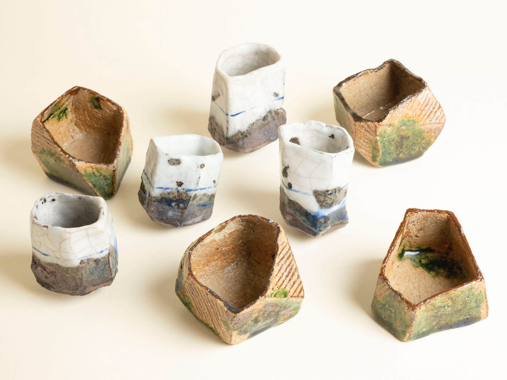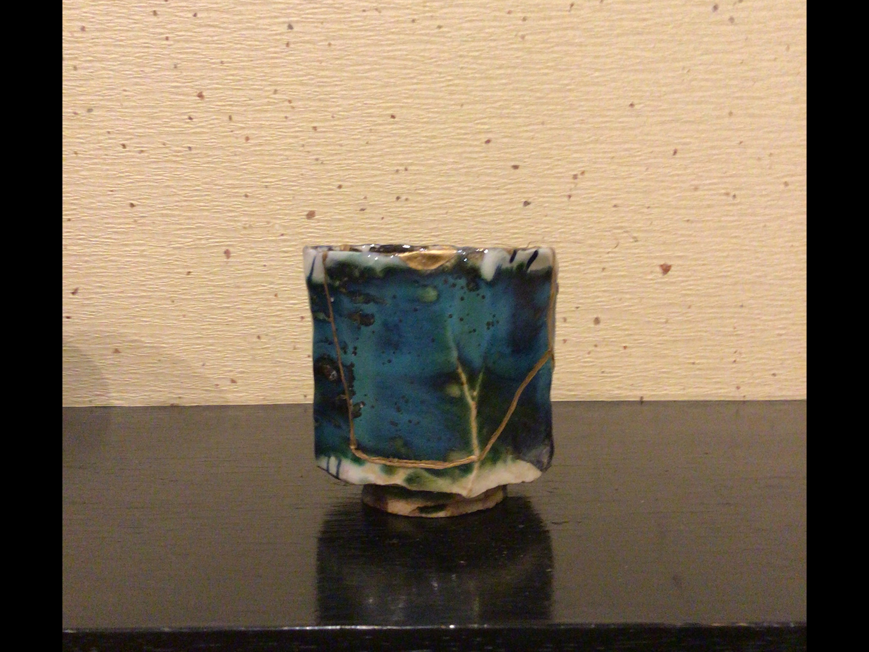 すし屋の湯呑み 青磁八角形湯呑み 9.5cm×10cm 削り出し八角形の湯呑みは、先ずは外側の形を決める。 それから内側をひたすら削って、白化粧。 イイ形になったら高台も削る。 素焼き。 外側に黒化粧、白化粧。 染め付けも付ける。 青磁をたっぷりと掛ける。 本焼き。 下から黒化粧と染め付けが薄く見え、釉の切れ目から白地と呉須を覗かせながら、辛うじて流れ留まっている青磁釉が美しい。 しかし、これらは決して計算し尽くしての結果ではない。 天か地か、みんな女神さまの気まぐれなのだ。