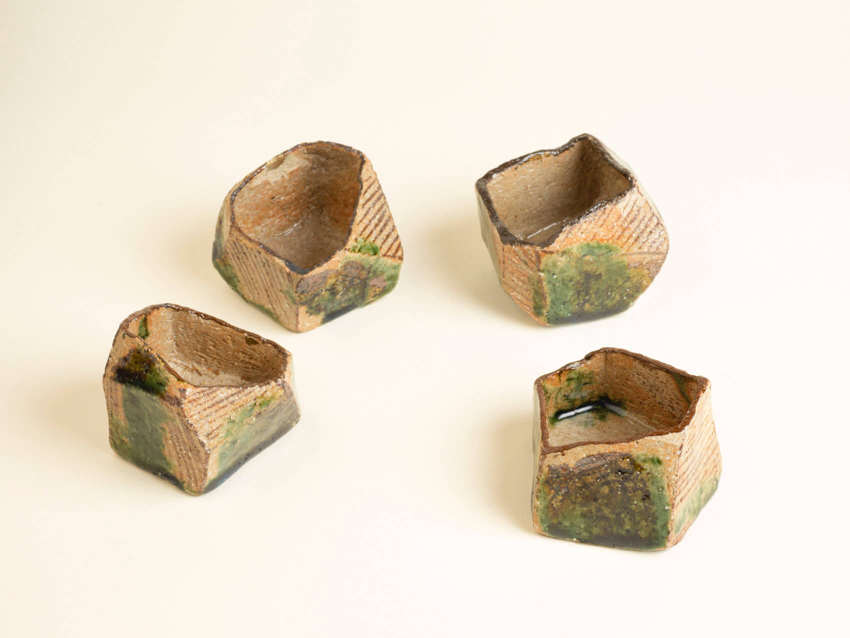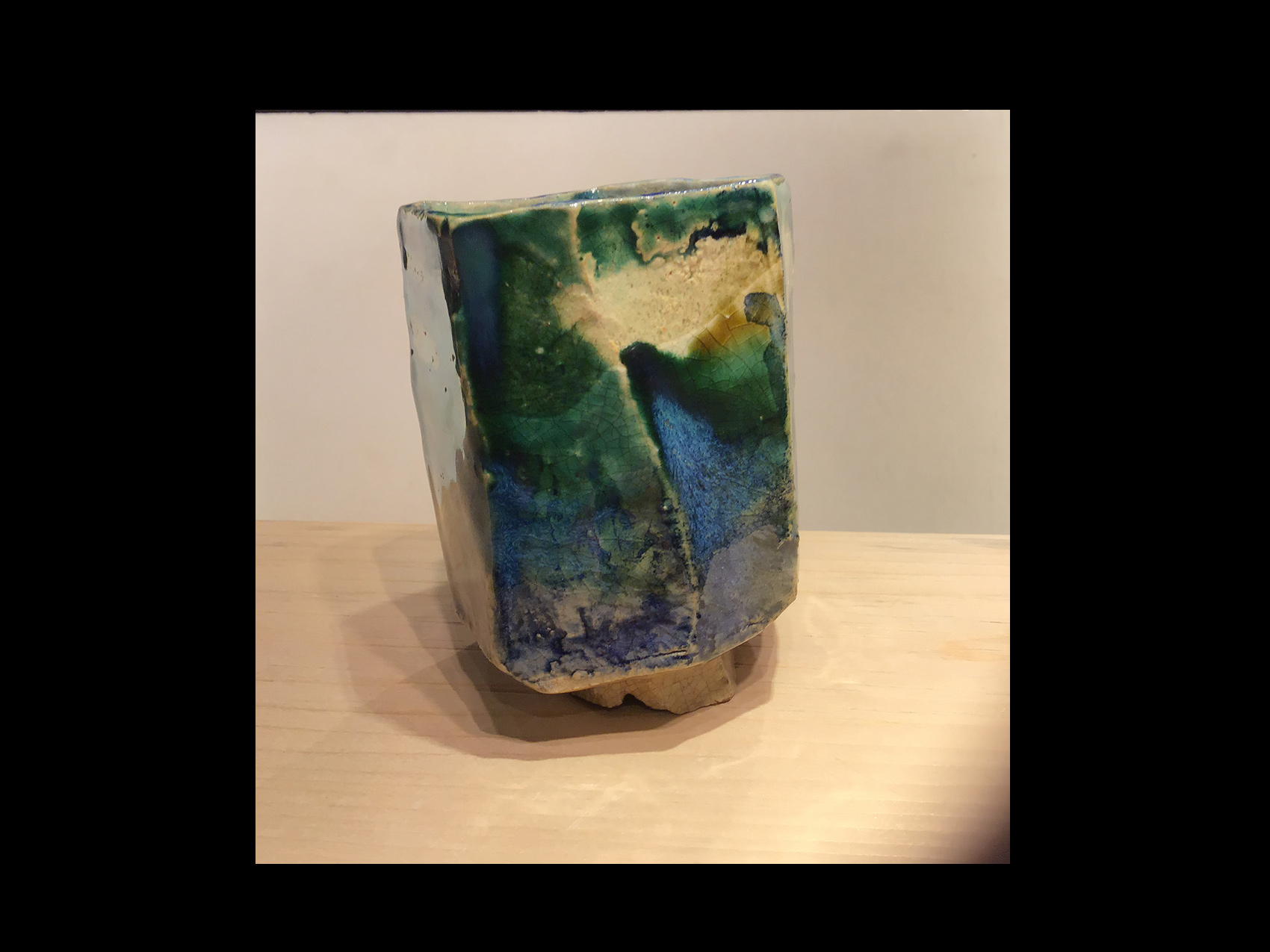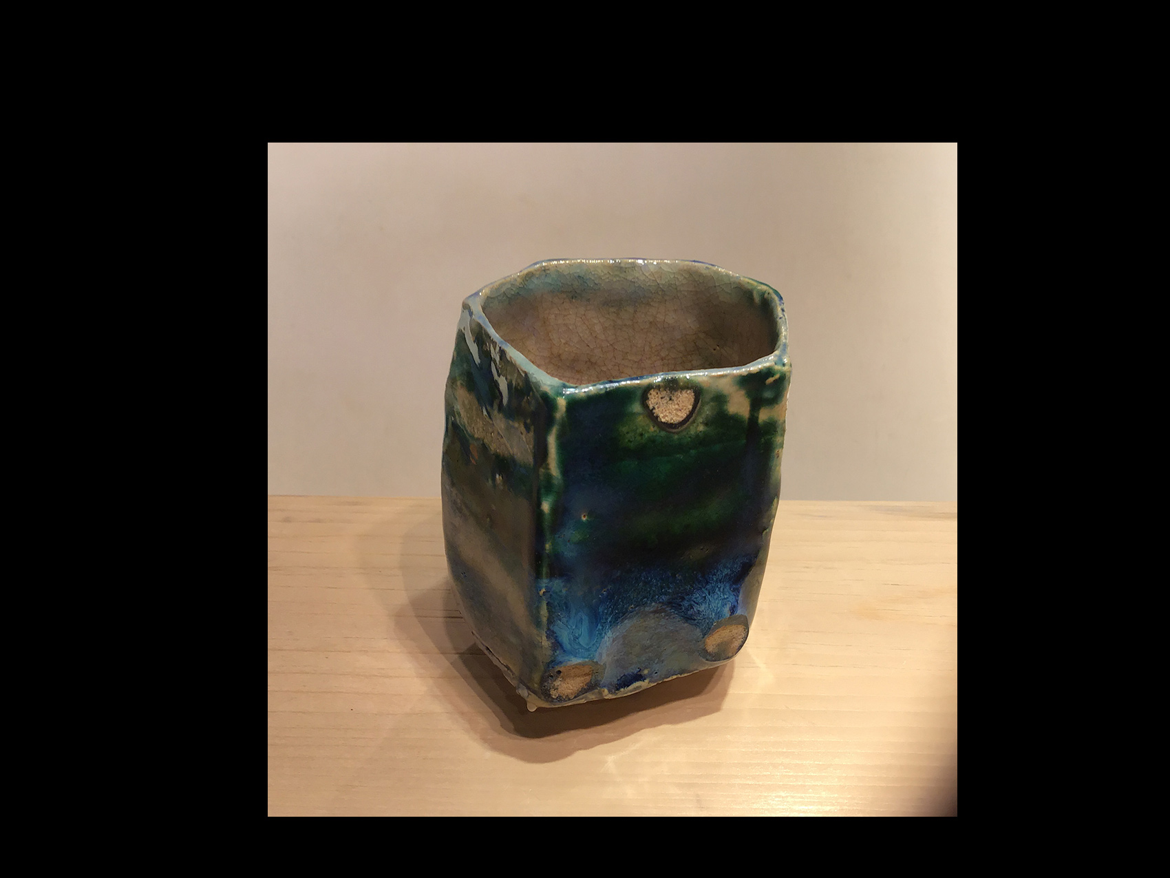 すし屋の湯呑み 五角形総織部 7.5×6 土塊から彫り出した五角形の湯呑みの内側は白化粧を、外側には織部釉をしっかりと濃いめに流し掛けする。 横に倒した状態で本焼き。 織部釉が流れて、面白い景色となった。 日本陶芸倶楽部の織部釉薬は発色が素晴らしく、いつも出来上がりが楽しみだ。 好きな湯呑みであった。