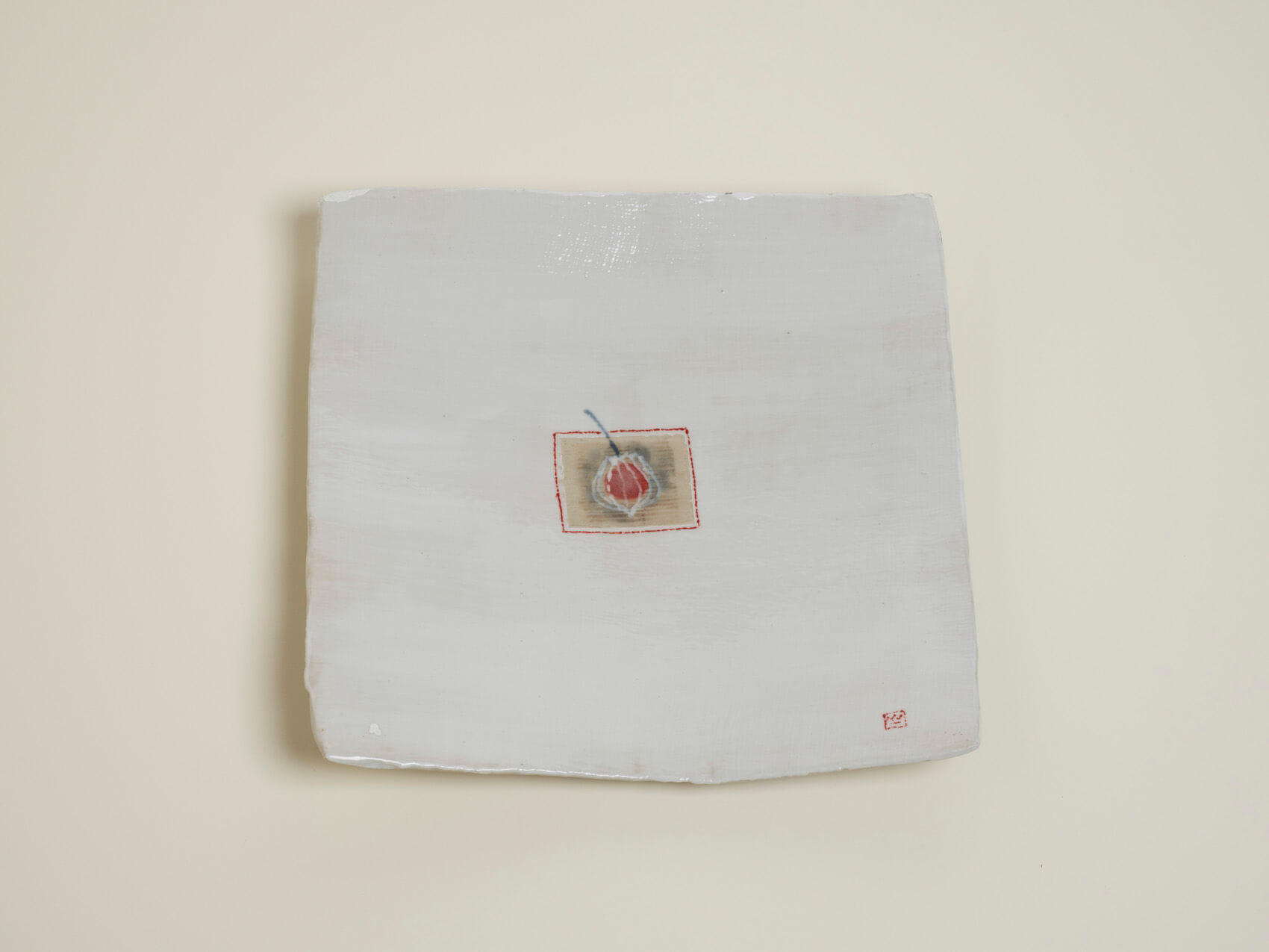下絵付け鬼ホウヅキ白角皿 22×22×2 皿の真ん中を四角に伏せ、下絵付けの白を全体にしっかりと塗りこめる。 伏せを剥がし、赤で枠を描き、その中に鬼ほおづきを描く。 以前、秋津マキコさんの撮られた鬼ほおづきの写真に感動し、ぜひ器に写したいと願っていたのもので、可愛らしく綺麗に写せて嬉しかった。 赤と白の使い方が上手くいったなぁと、密かに喜んでいたら、日本陶芸倶楽部秋の品評会で、最優秀賞受賞。 よかった、ヨカッタ‼️