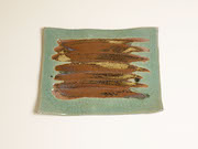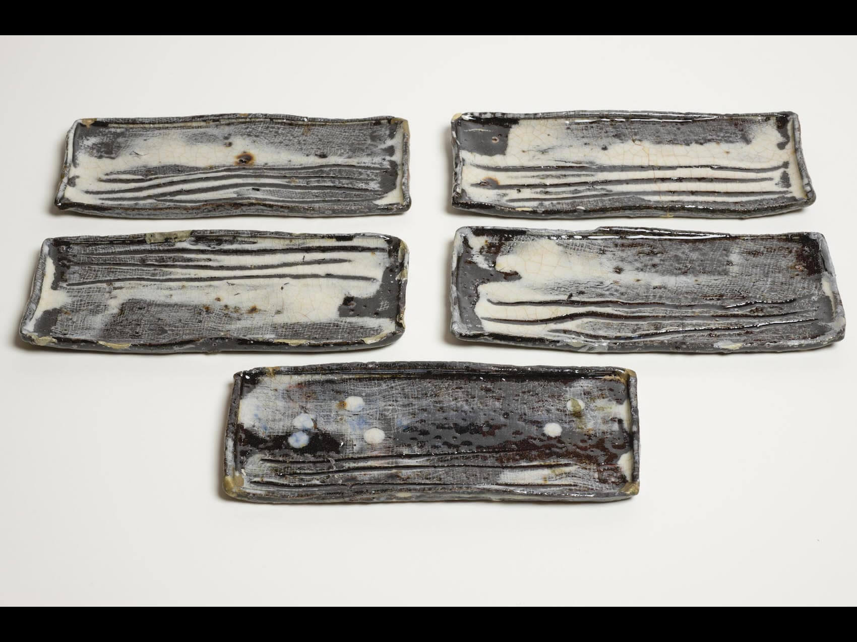 長形流し掛け握り皿 41×13×0.3 タタラで長めの長形皿を気ままに切って行く。 布目を付け、少し削り目を入れ、白化粧を大雑把に塗り、素焼き。 呉須、鉄、織部釉を斜めにザッと掛け、透明釉。 本焼き。 二人用の握り皿、刺身皿として使用。 僕の作る皿としては、ずいぶんと地味な感じの出来上がりなのだが、魚を乗せると色が映え、面白いものとなった。