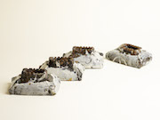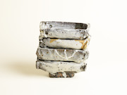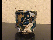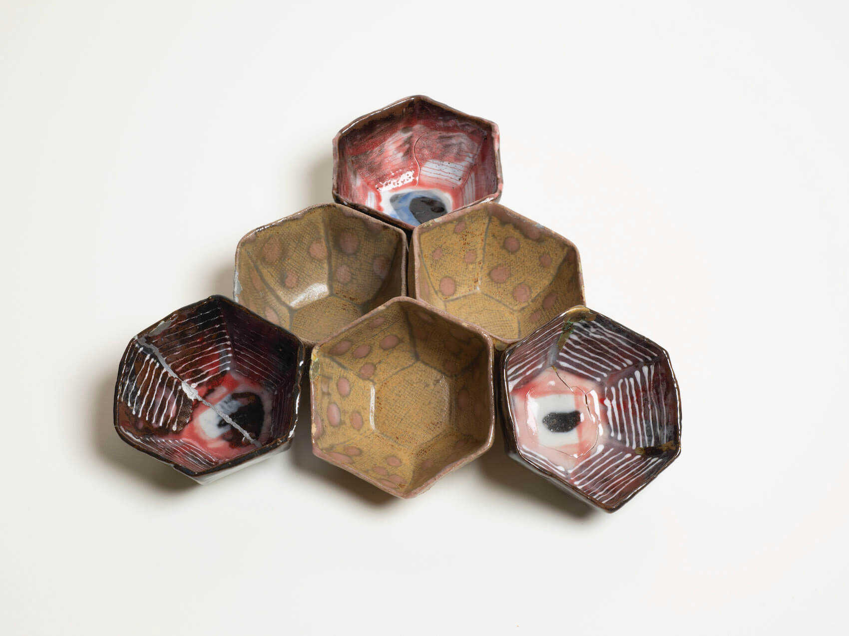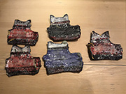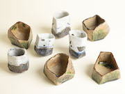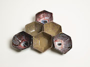 六角小鉢 7×7×7 小鉢もずいぶん沢山作ったのだのが、とにかく割れに割れる。 割れると意地になって金継ぎ、銀継ぎの繰り返しだ。 東北太平洋地震の時は暇だったので、しまってあったものまでも引っ張り出し、毎日数十個づつ直していった。 この小鉢達は、石膏の型とりで、三個は白化粧、素焼き。 伊羅保釉を掛けタンパンを点々と掛け本焼き。 他の三個は、下絵付けの赤と黒と白を使って悪戯し、透明釉。最初はちよっと派手かな、少し地味かな、という感じだったのだが、使っているうちに眼に馴染み、使い勝手が良くなっていった。
