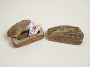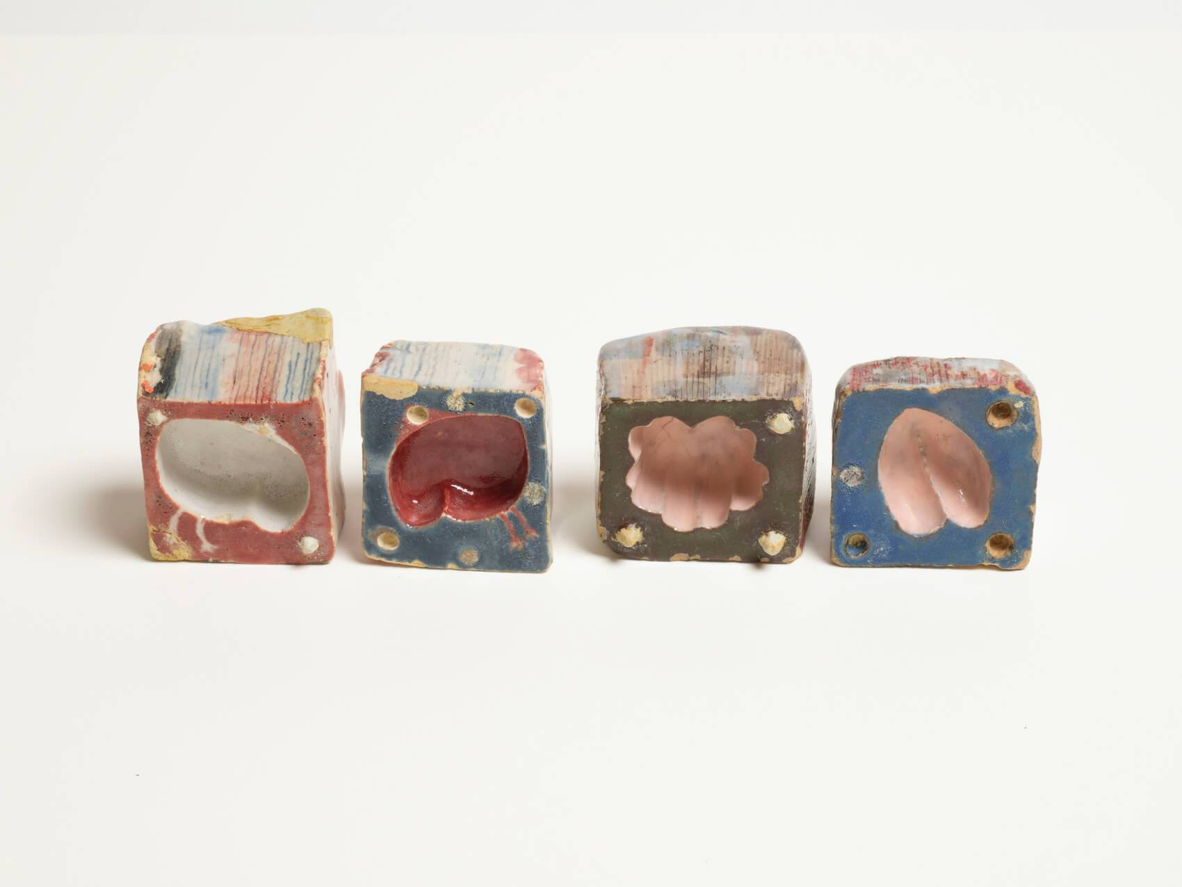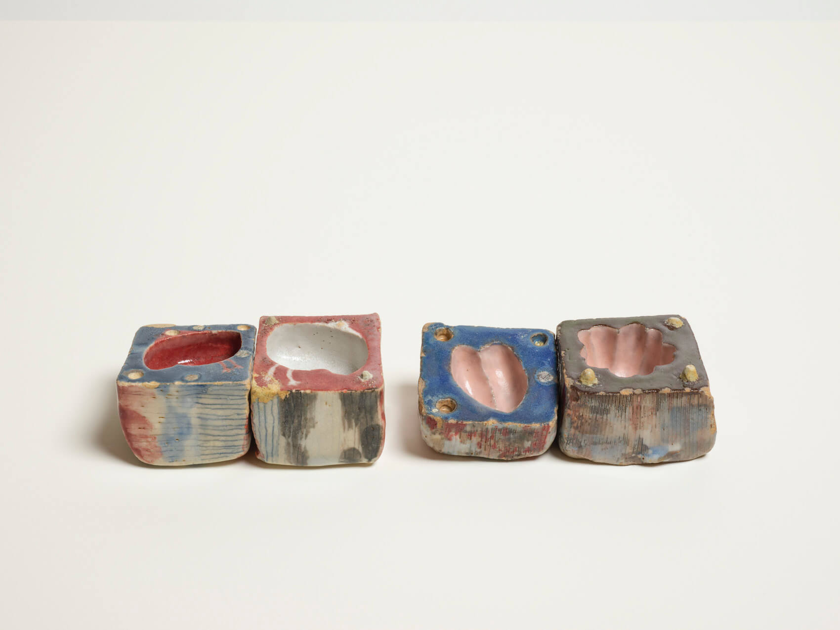 蓋もの、波の花&珍味入れ 4.5×4.5×6 蓋もの二種。 店では波の花(塩)の入れものになった。 一方の、身にあたる陶箱の部位には桜の花を、蓋の部位には花びらをキッチリと彫り、共に桜色に染める。 もう一方には、身.蓋共に千鳥を対照的になる様に彫り込み、白と赤を入れ、それぞれに白と赤の脚を付ける。 小物を作る時は、いつもワクワクで、次から次へとアイデアが湧き出し、抑えるのに苦労する。 可愛い出来で、ほっとした。