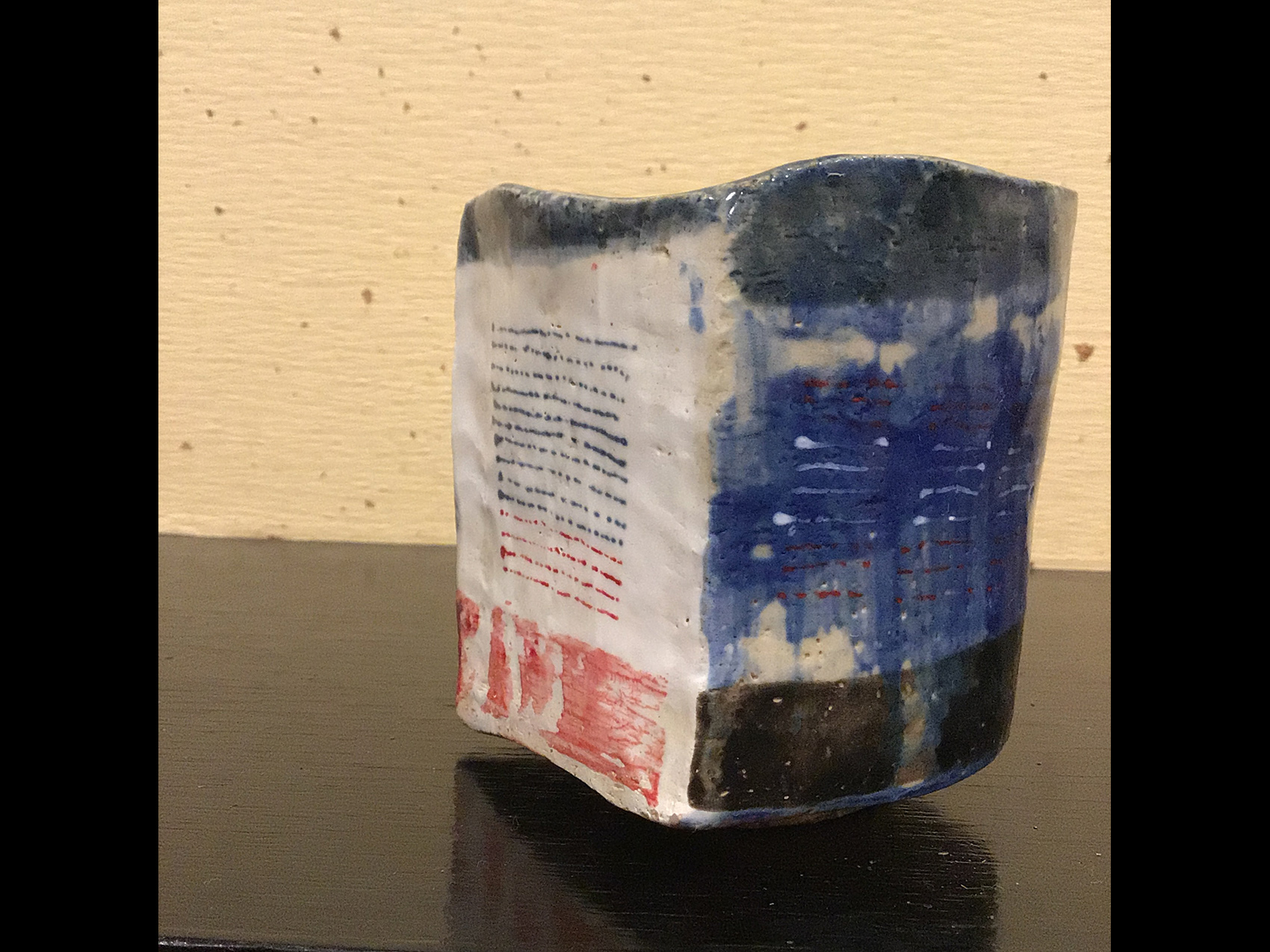 変形半月下絵付け縫い針模様湯呑み 9×8.5 土塊を半月の形に垂直に掘り、削りが完成して白化粧、素焼き。 平面部位に白を塗り、その上に縫い針模様の線を青と赤で入れる。 下部に赤を平筆で刷く。 曲面の上下に黒、その間に青を掃き白線を入れる。 透明釉、本焼き。 色々とやったのだが、結果的には面白さが集約的に調整されて現れてきた。