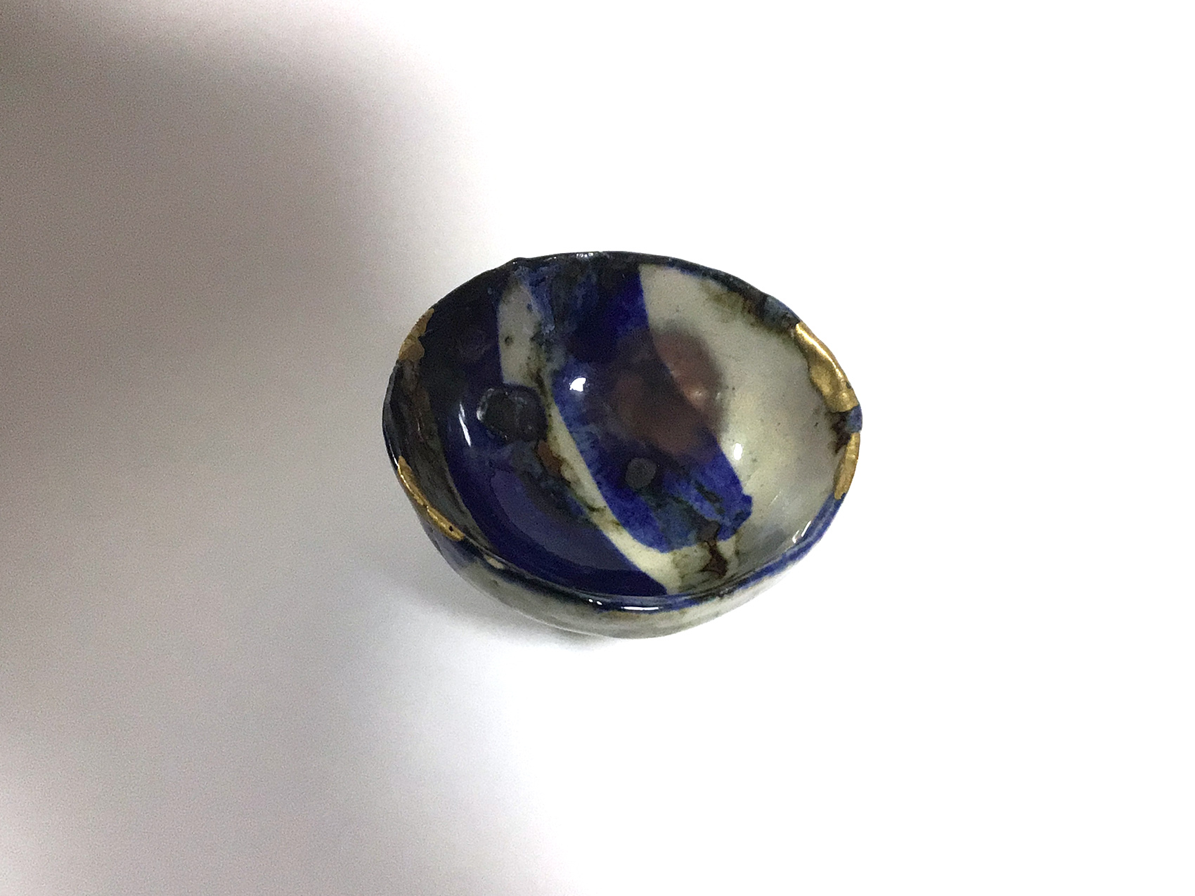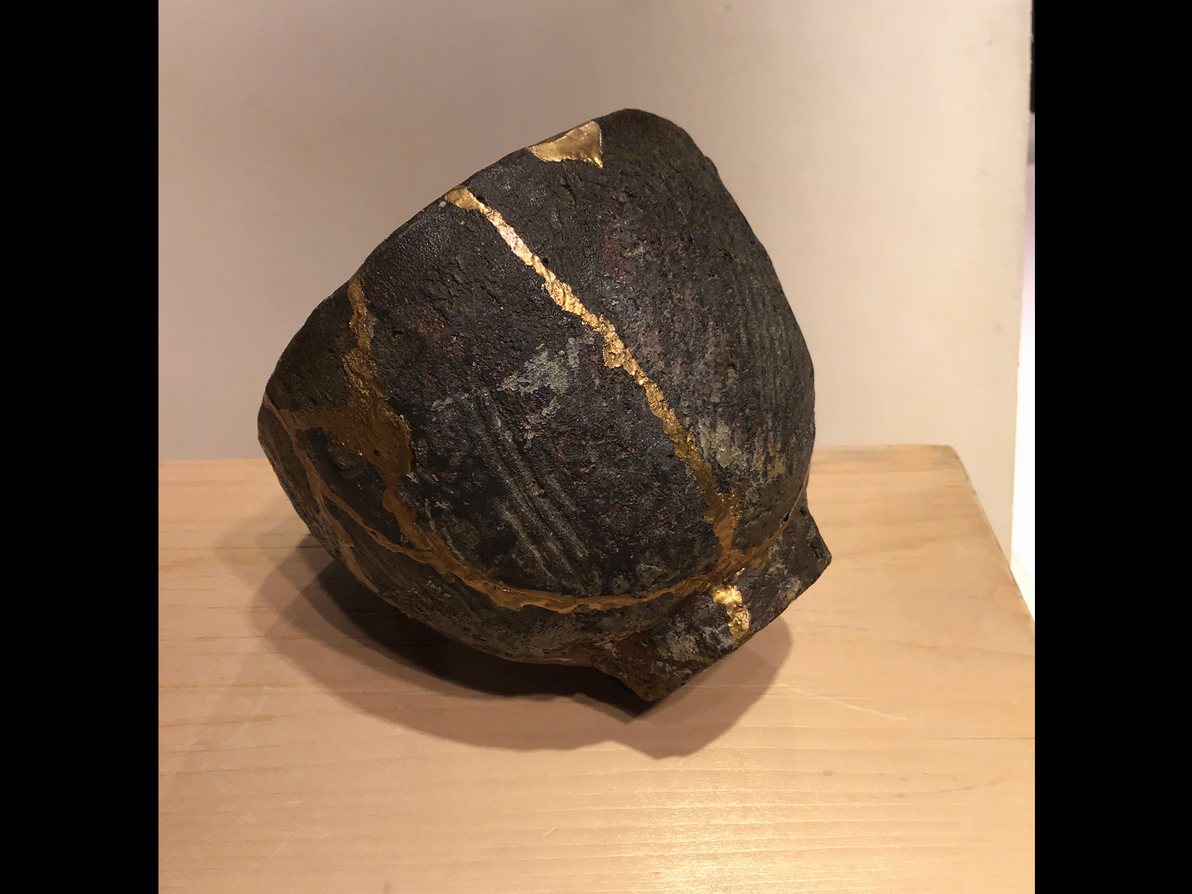 南蛮井戸茶碗写し① 11.5×9.2 南蛮焼きの作家、山本安朗さんから頂いた南蛮の土で作った。 初めての茶碗は井戸茶碗風に出来たのだが、見事に割られ、泣く泣く愛を込めて、金継ぎをした。 25年の歳月と、風っさらしの風合いが、古色さえもまとわり付き、面白く愛しい茶碗となっている。