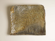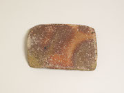 信楽焼き締め大皿 裏面 35×32×2 長年陶芸をやっていると、必ず大物を作って見たくなる時期がある。 この皿は、70×64×2という、物凄く大物の皿で、信楽のトップ作家である古谷道生さんの土を特別に分けて頂いての作陶となった。 大量の土を練って練って練りまくった。 叩いて叩いて、たたきだした。 厚さ5センチ位の80×70位の大きさに叩き出した。 そして今度は削り出しだ。 表裏を削って削って削りまくりだ。 そうして出来た皿が、乾燥の最中に真っ二つにヒビが入った。 窯焚きの日時ぎりぎりに、しょうがないと、真っ二つに切り離した。 それでもまだ、二枚となった大皿の焼成となった。 結果的には、このサイズが、重量ともに、使用する皿としての適性ギリギリのものとなった。 見事な灰被りと、窯変の面白さを併せ持つ、重厚な大皿となった。