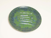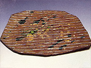 上絵付け金銀彩多角形皿 赤土のに白化粧の横線を引き、さらに点々と模様に垂らし、透明釉を掛け本焼き。 上絵付けの緑と金を垂らした白化粧の上に塗り、更に焼く。 赤土のお陰で、緑と金の発色が落ち着いたものとなり、刺身皿として多用されることになった。 初めて上絵金銀彩の講座に参加しての作品となった。