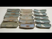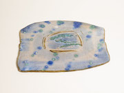 青磁長形握り皿 25×16.5×0.5 日本陶芸倶楽部の青磁釉は素晴らしい。 薄く掛けると高麗青磁風に、濃くすると南宋青磁風に発色してくれる。 今回は、信楽の白っぽい土で素焼きした皿の上下を細長く伏せ、青磁釉を尺掛けする。 上下の抜いた部位には染め付けを刷毛塗りする。 単純明快、スッキリと爽やかな握り皿になった。 青磁は様々な握りの色彩の美しさを映えさしてくれるのだが、青磁が少し崩れて面白ろかった。