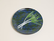 上絵、長ネギ図握り皿 22×22×2.5 伊藤北斗先生の西洋絵の具による特別講座で、長ネギを描く。 白の貼り絵のテープを間隔を開けて全面に貼る。 その上に長ネギを描く この1年、根の付いた長ネギを探して、農家から2束も送ってもらっていた。 ネギ、葱、ねぎ、と長ネギをいっぱい描いてきた。 そして遂にその時が来た。 3本重ねた白茎は上手く色が出るのか? 可愛い根っこの白くて細いひげは? 葉っぱの緑は如何に? 難題が山盛りであった。 試験焼き無しの一発勝負。手を合わせてお祈りだ! 幸運の女神様は又も舞い降りてくれました。 感謝、感謝!合掌!