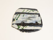線彫り下絵付け刺身皿 28.5×27×0.4 変形丸皿の全体に黒化粧。 布目を付けた丸皿全体に、横線を4mm幅に彫る。 素焼き。 余白をラテックスで伏せ、全体に黒化粧。 ラテックスを剥がして色を入れてゆく。 最後に白の円を描き透明釉、酸化焼成。 30分独占のテレビ番組で、趣味の陶芸で皿を5枚作ることになり、一心不乱にやったのだが、もう一つ面白みが出なかったようだ。