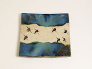 飛翔鶴、絵織部角中皿 24×24×2 角皿の両端を大胆に、どばっと織部釉に漬け込む。 釉薬が流れ、大海の波ように押し寄せている。 その波の狭間を二組の鶴の親子が二羽三羽と飛翔してゆく。 凄く好きな皿で、二人用の刺身皿として重宝に多用した。