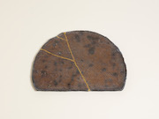 南蛮焼半月皿 13×7.5×0.3 南蛮焼は、利休が東南アジアの一部で焼かれている焼物を見立てて総称したもので、茶陶の世界では数々の名品が伝来している。 後に小山富士男と中里隆が種子島の土で見事に再現している。 ある時、小山富士男のぐい呑みが、三越本店のウインドウに単独で展示されているのを発見した時、打ち震えて持ち帰ったものだつた。 その後数年、その南蛮を追いかけている作家に幸運にもえ出逢い、一緒に作陶、穴窯の焼成までをもさせて頂くことになつた。 土曜の夜に行き、深夜に作陶、いっぱい呑んで、翌日昼、半乾きのものを、さらにいじって完成。 生を乾燥させたまま、直接本焼きに入る。 上手く焼けて、使うのが嬉しかった。 金継ぎあり。