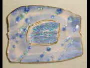 海中遊泳魚図長形刺身皿 33×26×0.3 染め付け、鉄、タンパン、白化粧等を使って、無数の泡が立ち上がる海中を、自由自在に泳いでいるサヨリの情景を描いた。 あまりに色々やり過ぎて、何をやったかよく覚えていないのだが、とにかく綺麗で面白い発色が引き出されていて、上出来、大満足であった。 日本陶芸倶楽部品評会、最優秀賞受賞。